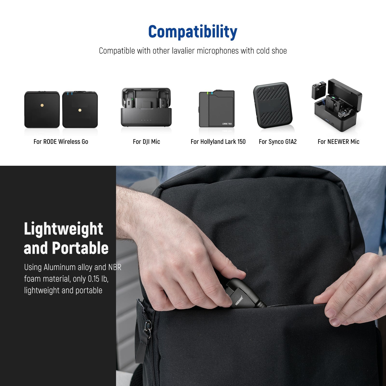 • Compatibilidad: Compatible con RODE Wireless Go, DJI Mic, Hollyland Lark 150, Synco G1/A2, SmallRig W60 y otros micrófonos de solapa con zapata fría
