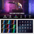 - Píxeles controlables de forma independiente de 24 bits : los píxeles de 24 bits le permiten ajustar de forma independiente el brillo, la temperatura del color y los efectos de iluminación de cada sección de píxeles. Este equipo de iluminación de video LED cuenta con 7 efectos de píxeles (reemplazo de color, rotación de color, color único/doble/triple, efectos de arcoíris y llama controlada por puntos) y 18 escenas especiales, ideales para grabación de videos, filmación de sesiones de fotos en estudio, selfies creativos, fotografía con cámara, transmisión en vivo de juegos, etc.