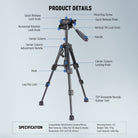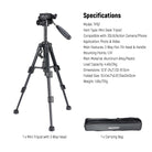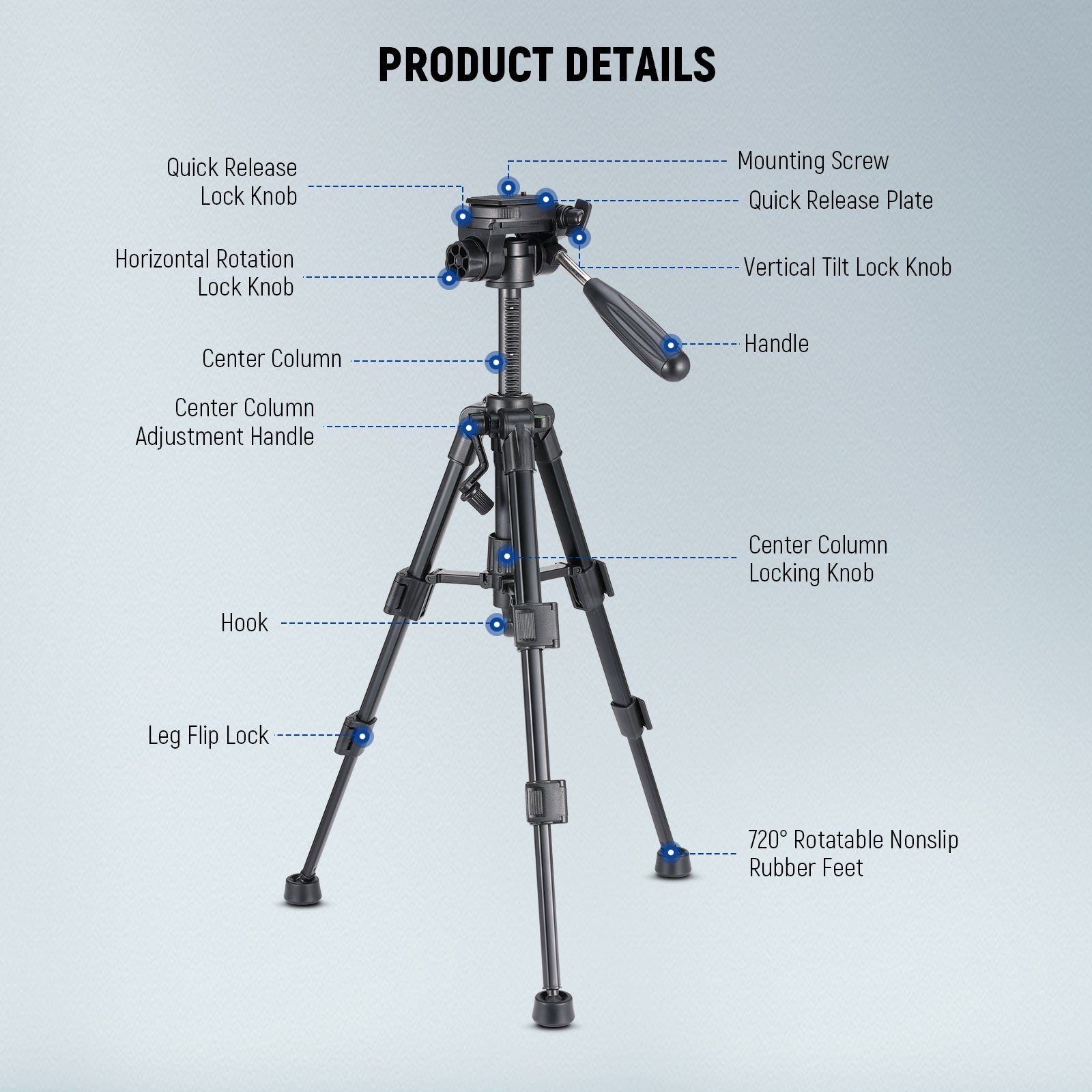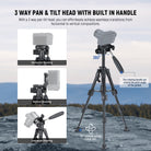 - Cabezal de inclinación y giro de 3 posiciones y manija incorporada : con un cabezal de inclinación y giro de 3 posiciones, puede lograr transiciones perfectas de composiciones horizontales a verticales sin esfuerzo. La manija incorporada y el nivel de burbuja garantizan ajustes rápidos y fáciles, mientras que las patas de goma antideslizantes giratorias de 720° brindan estabilidad en cualquier terreno