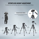 - Ajuste de altura sin esfuerzo : el trípode ofrece un ajuste de altura sin esfuerzo gracias a su diseño versátil. Las patas de 3 secciones se pueden ajustar fácilmente de 9,8"/25 cm a 18,9"/48 cm mediante cierres abatibles, mientras que la columna central se puede elevar adicionalmente hasta 3,2"/8 cm. Con un rango de altura total de 12,6"~24,2"/32~61,5 cm, este trípode proporciona flexibilidad para capturar la toma perfecta en cualquier situación.
