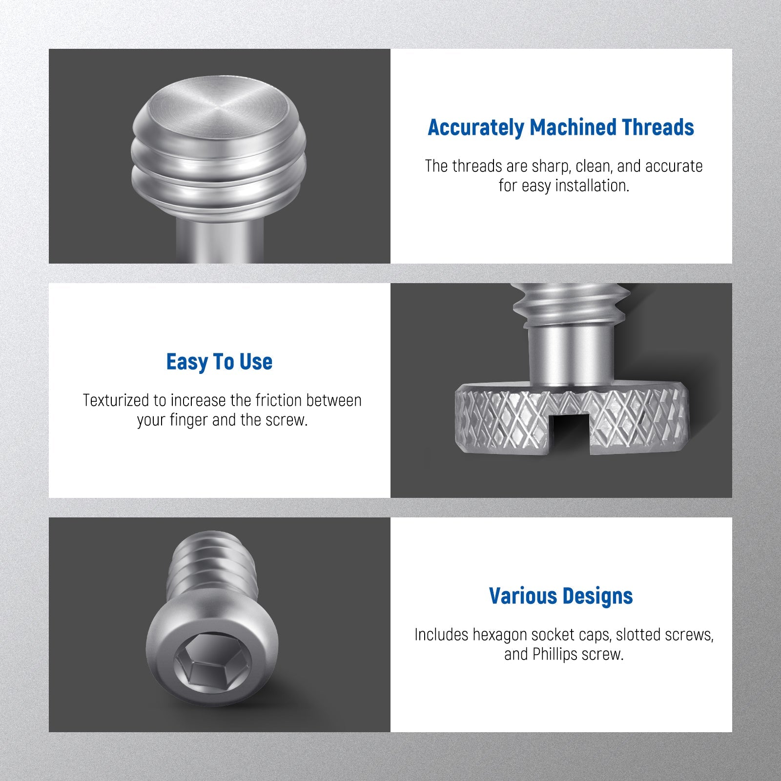 - Tamaño de tornillo preciso y exacto : con medición precisa y tecnología mecanizada CNC, los tornillos de diferentes especificaciones se construyen con roscas precisas. Amplia y perfectamente compatible con soportes para teléfonos, soportes para cámaras, asas superiores para cámaras, placas de liberación rápida y más.
