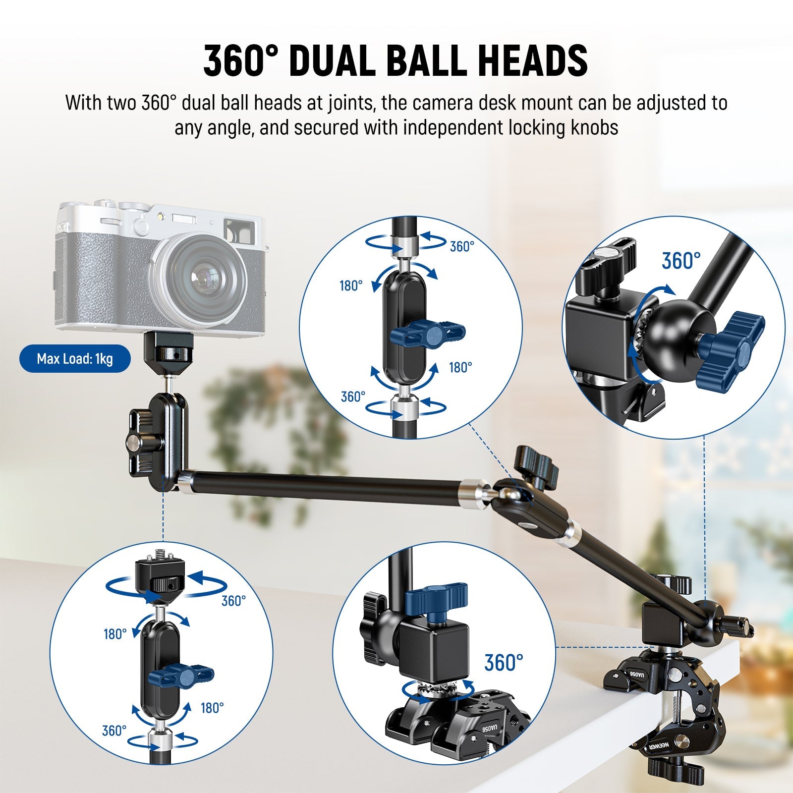 - Rótulas esféricas dobles de 360° y alcance extendido de 30"/75 cm : con un brazo articulado de dos secciones de 30"/75 cm y rótulas esféricas dobles de 360° en las articulaciones, el soporte de escritorio para cámara se puede ajustar a cualquier ángulo y asegurar con perillas de bloqueo independientes, ideal para tomas aéreas, vlogs, transmisión en vivo, grabación de videos de YouTube/TikTok, videoconferencias, llamadas de Zoom, etc. Nota: La súper abrazadera y el brazo mágico están conectados y no se pueden usar por separado.
