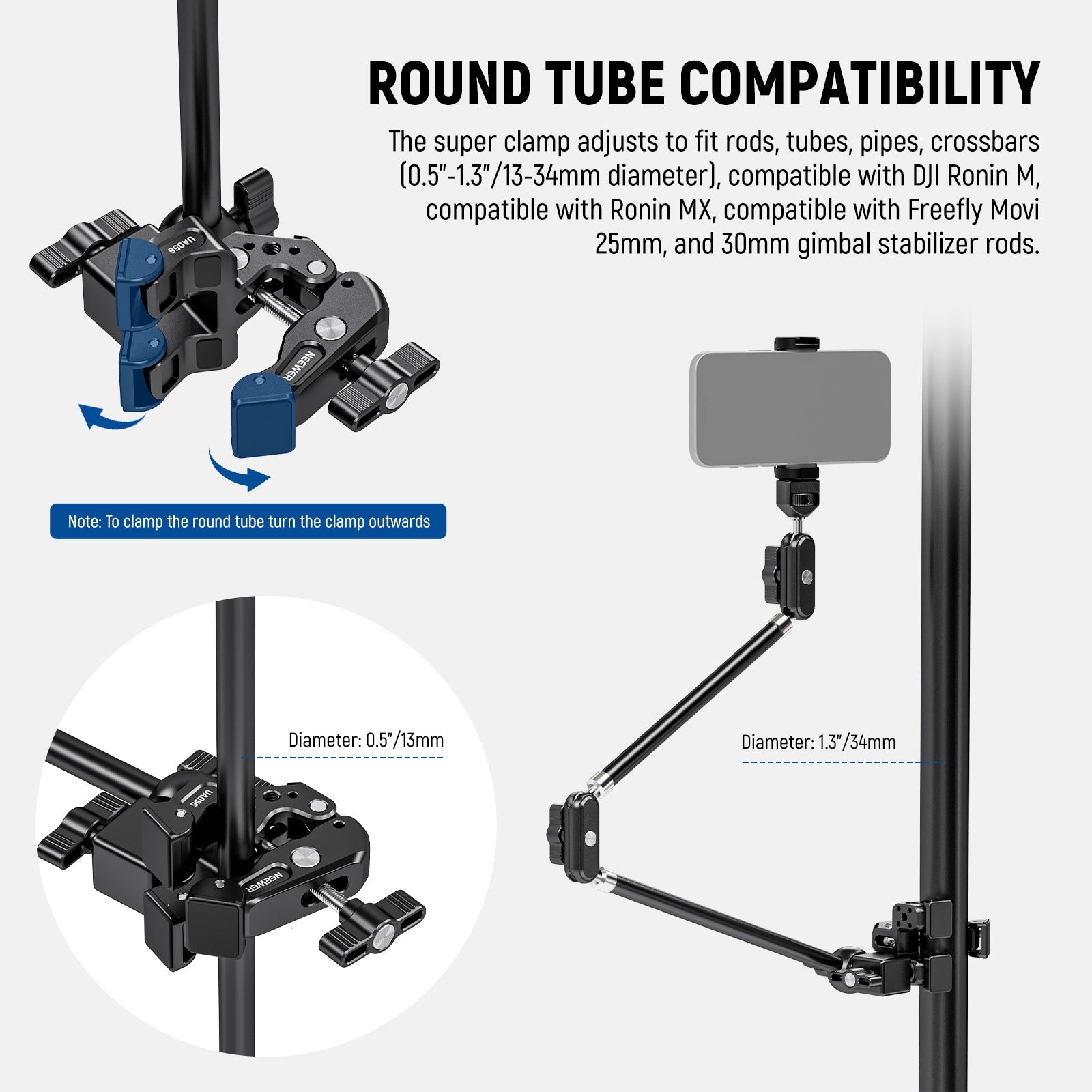 - Soporte de súper abrazadera de amplia compatibilidad : el súper abrazadera se ajusta para adaptarse a superficies planas como escritorios y trípodes (grosor de 0,2"-1,6/5-40 mm), o varillas, tubos, caños, barras transversales (diámetro de 0,5"-1,3"/13-34 mm), compatible con DJI Ronin-M, compatible con Ronin MX, compatible con Freefly Movi 25 mm y varillas estabilizadoras de cardán de 30 mm. También con orificios para tornillos de 1/4" y 3/8" para tipo ARRI para montar jaulas, manijas o trípodes, y un soporte de zapata fría para luces de relleno LED, micrófonos, monitores, brazos mágicos, etc.