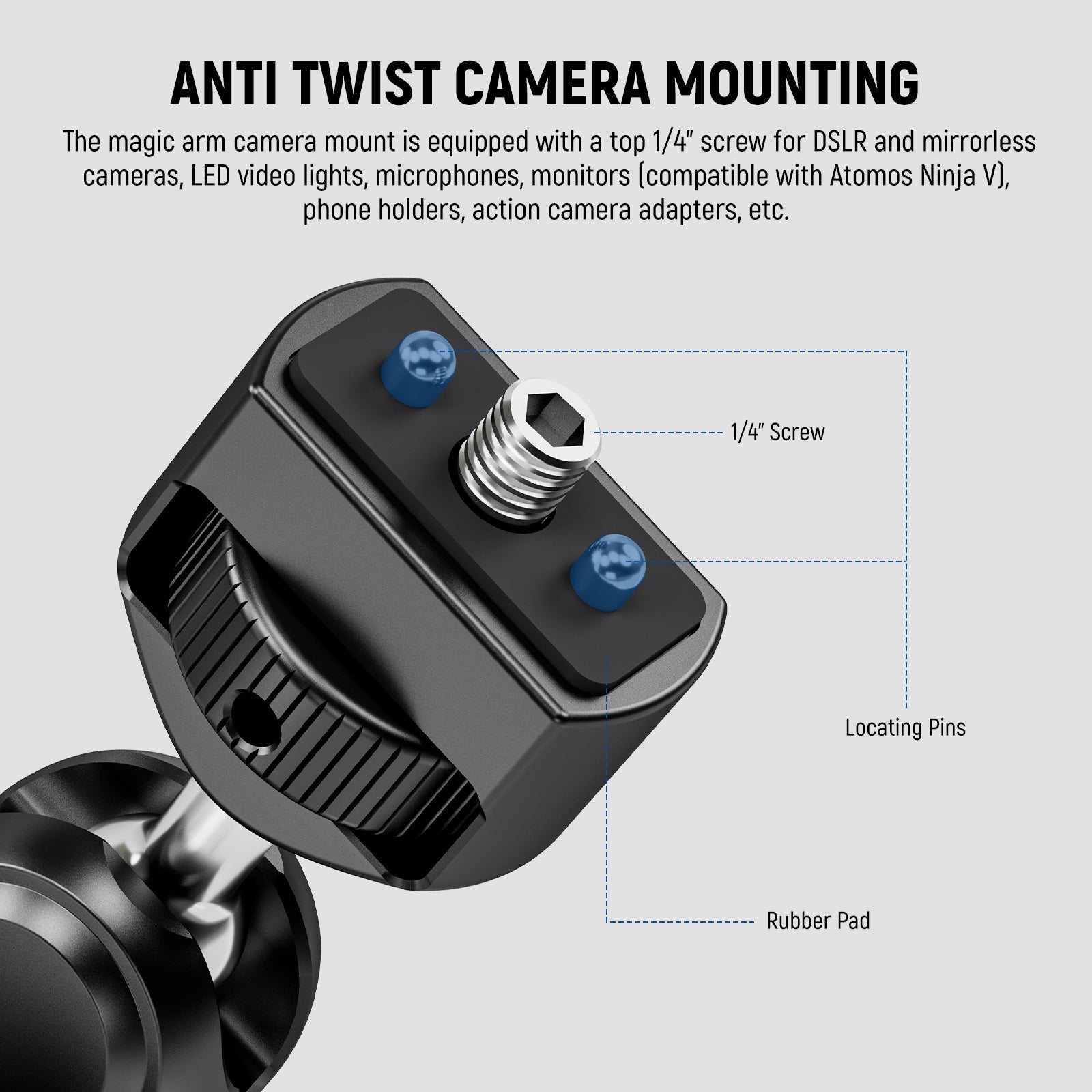 - Montaje de cámara anti-torsión : el soporte de cámara con brazo mágico está equipado con un tornillo superior de 1/4" para cámaras DSLR y sin espejo, luces de video LED, micrófonos, monitores (compatibles con Atomos Ninja V), soportes para teléfonos, adaptadores para cámaras de acción, etc. Los pasadores anti-torsión y las almohadillas de goma antideslizantes evitan que se tambalee o vibre durante el uso