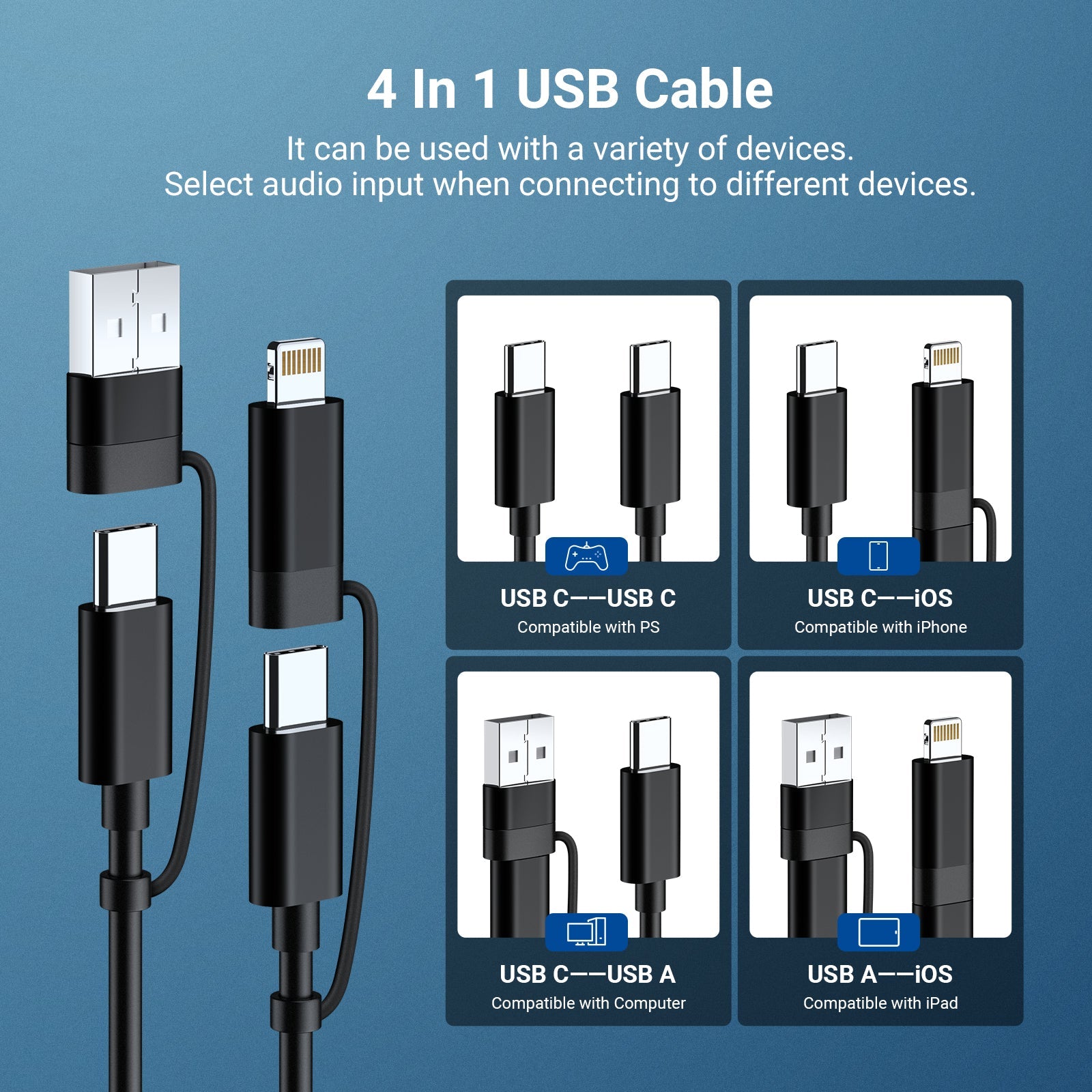 - Micrófono Plug & Play : Conéctalo a una computadora/portátil mediante el cable USB 4 en 1 incluido (conectores USB C, USB A e iOS) y empieza a hablar sin necesidad de controladores. Compatible con macOS, Windows, PC, iPhone y Android para videoconferencias, clases en línea, llamadas de Zoom, chat de videojuegos, podcasts de mesa redonda y mucho más. Nota: Configura el micrófono externo UM04 como dispositivo de entrada predeterminado cuando conectes varios dispositivos de audio a la PC. Algunos teléfonos pueden requerir la activación de la función OTG.