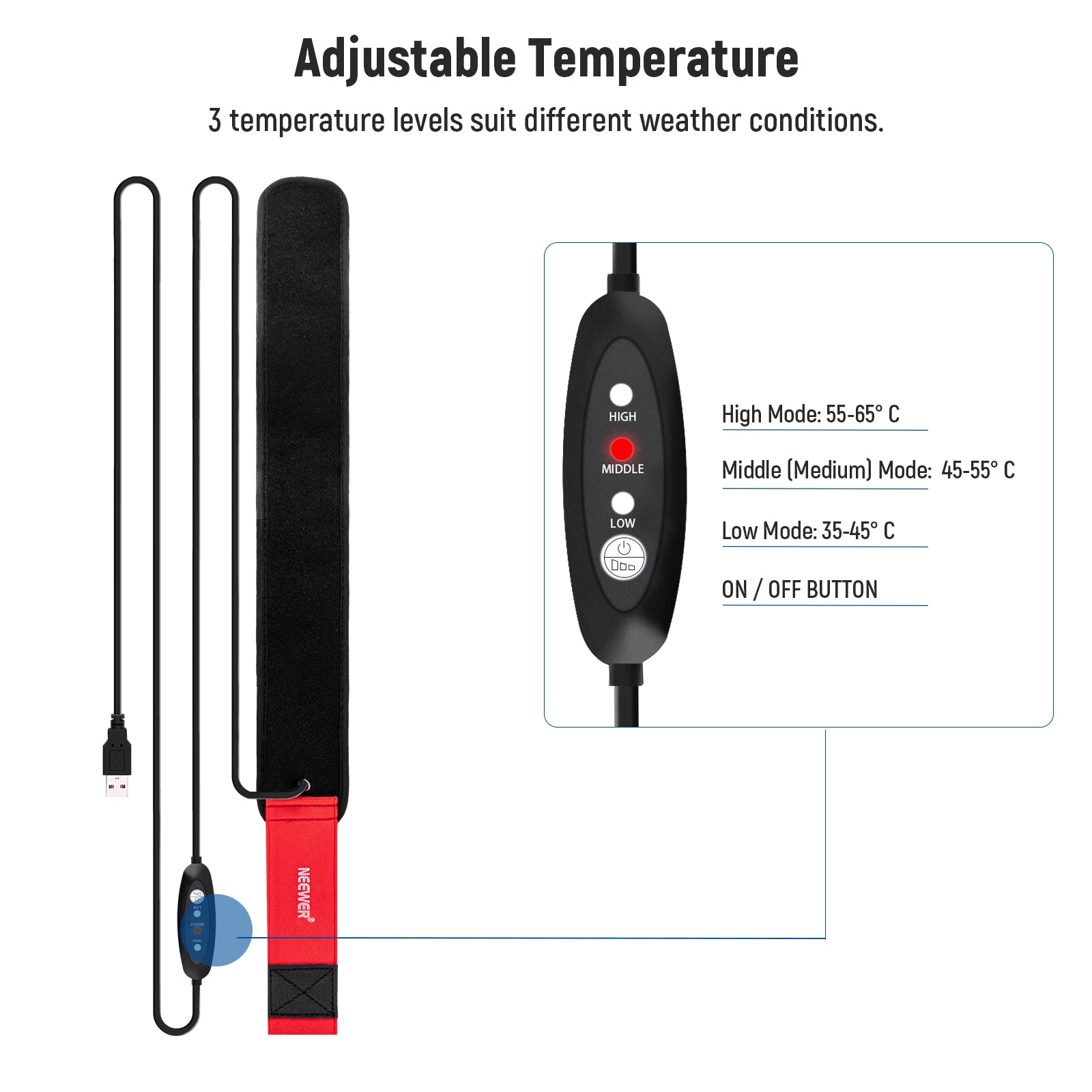 - Fuente de alimentación USB : conéctelo a un adaptador de corriente USB, un cargador portátil u otras fuentes de alimentación que ofrezcan una salida USB de 5 V 2 A. El cable USB de 4,9 pies/1,5 m de largo hace que el calentador sea ideal para uso en interiores y exteriores.