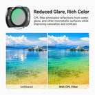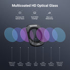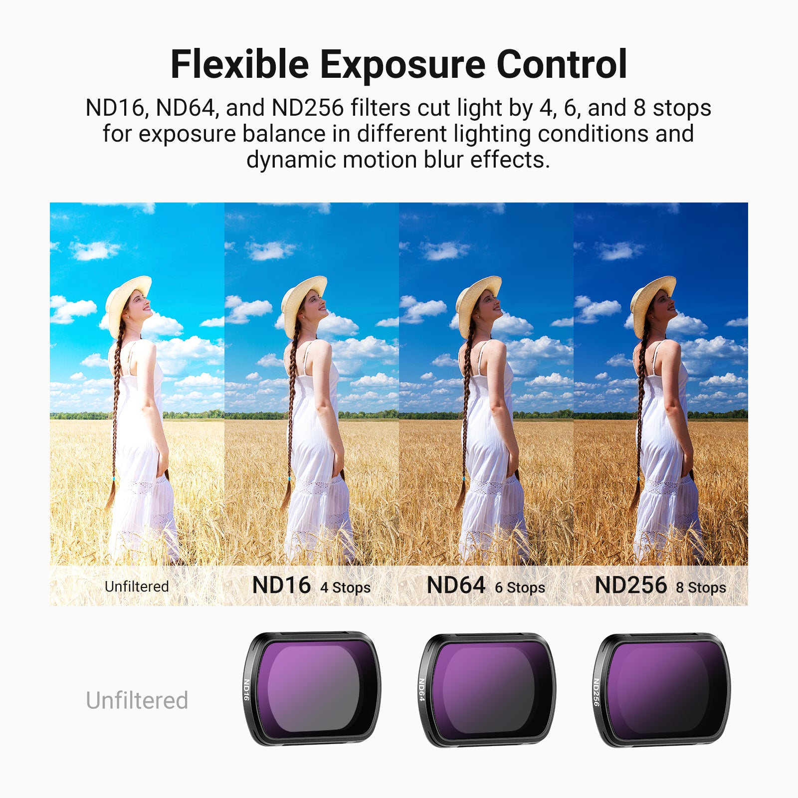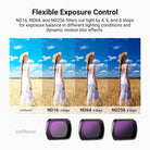 - Control de exposición flexible : Los filtros variables ND2-32 y ND64-512 ofrecen una reducción de luz de 1-5 y 6-9 pasos para equilibrar la exposición en diferentes condiciones de iluminación y crear efectos dinámicos de desenfoque de movimiento. Gire el marco para ajustar con precisión los niveles de densidad neutra.