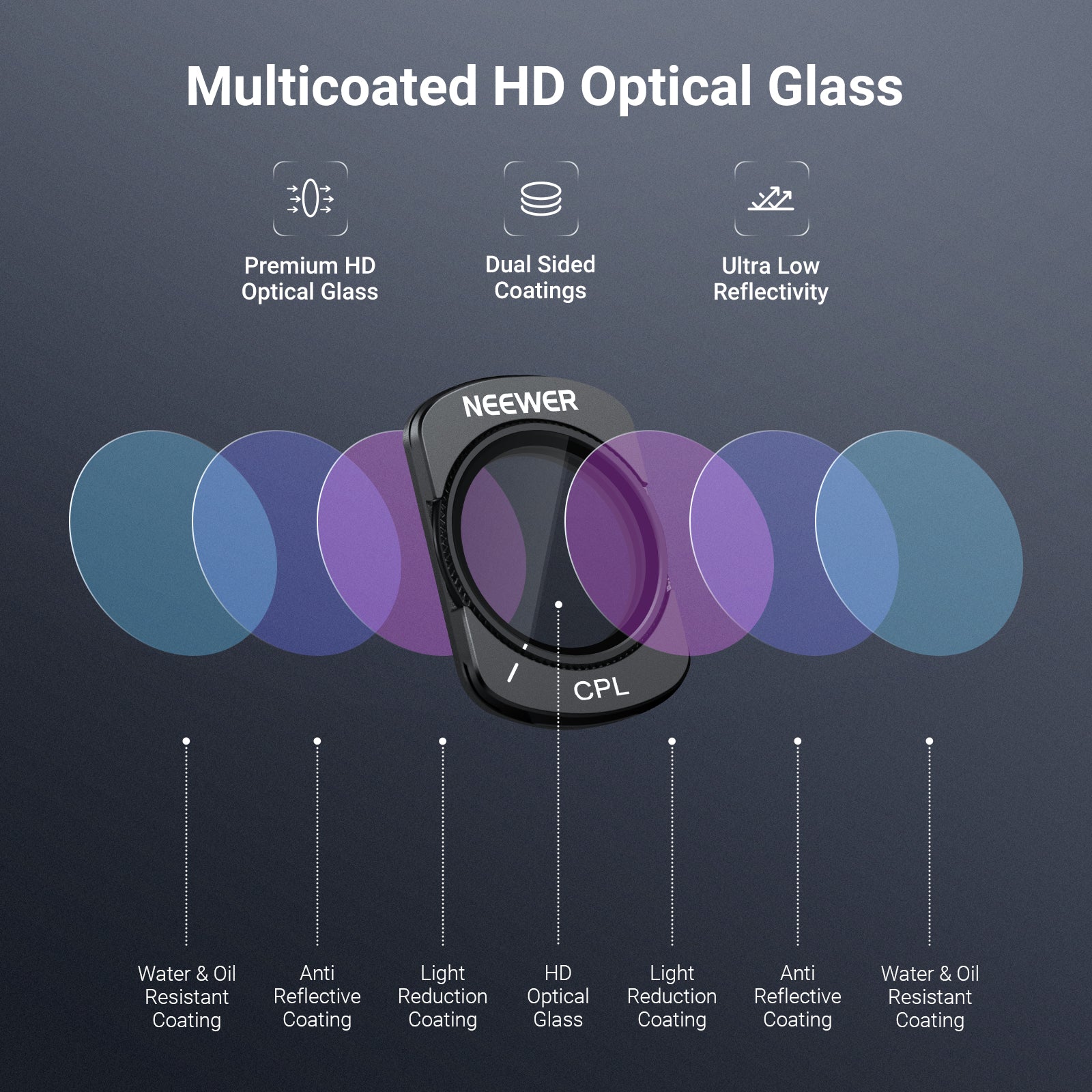 - Vidrio óptico HD multicapa : ofrece imágenes nítidas y resiste el agua, los rayones, las manchas y las huellas dactilares durante el uso diario.