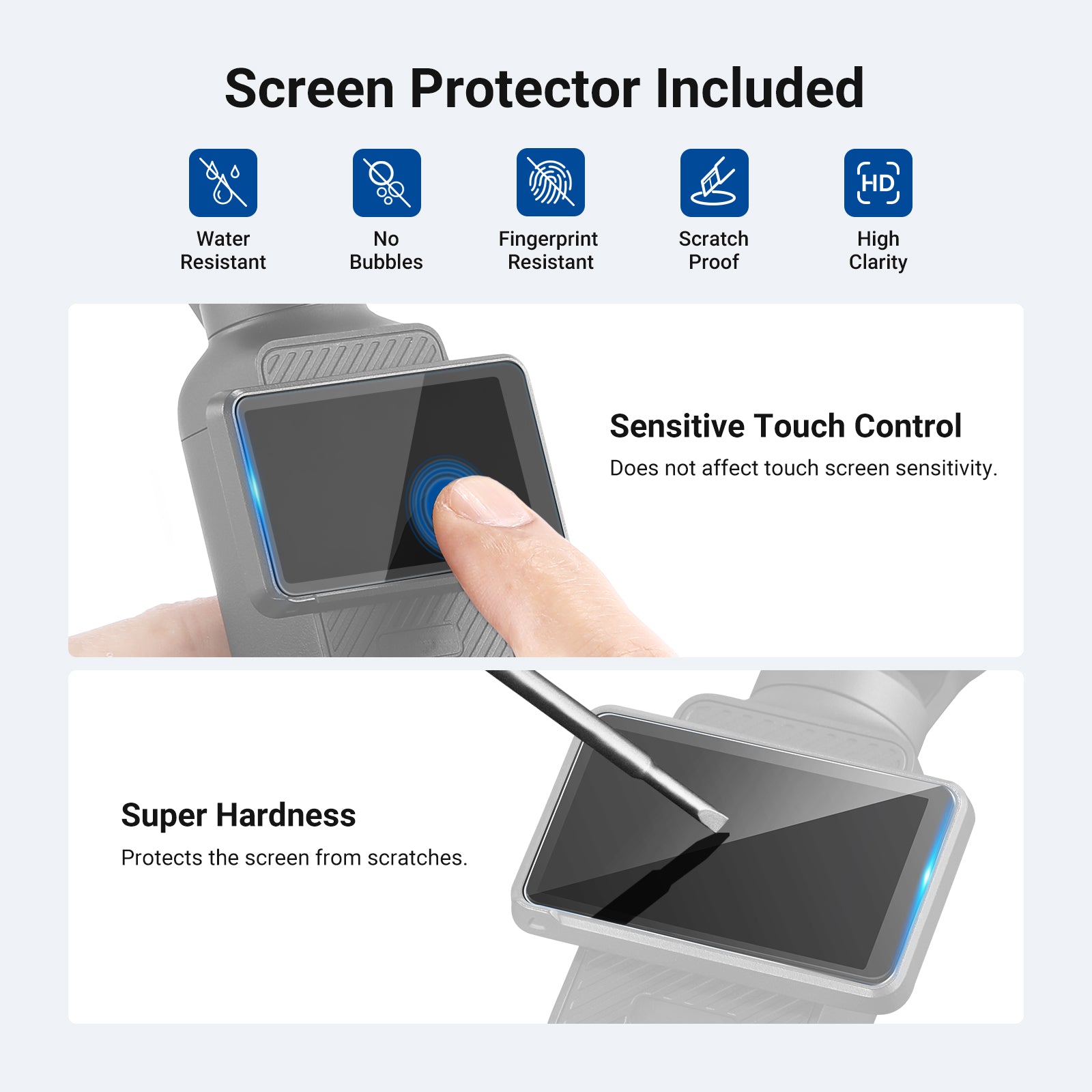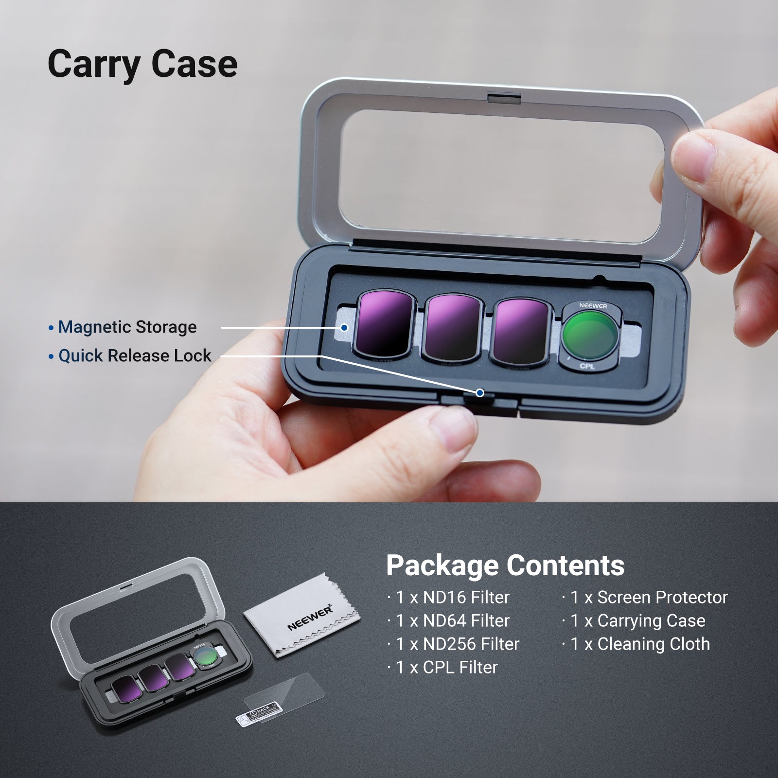- Protector de pantalla y estuche de transporte : el protector de pantalla protege la pantalla táctil contra rayones, mientras que el estuche de transporte magnético mantiene los filtros organizados, seguros y portátiles.
