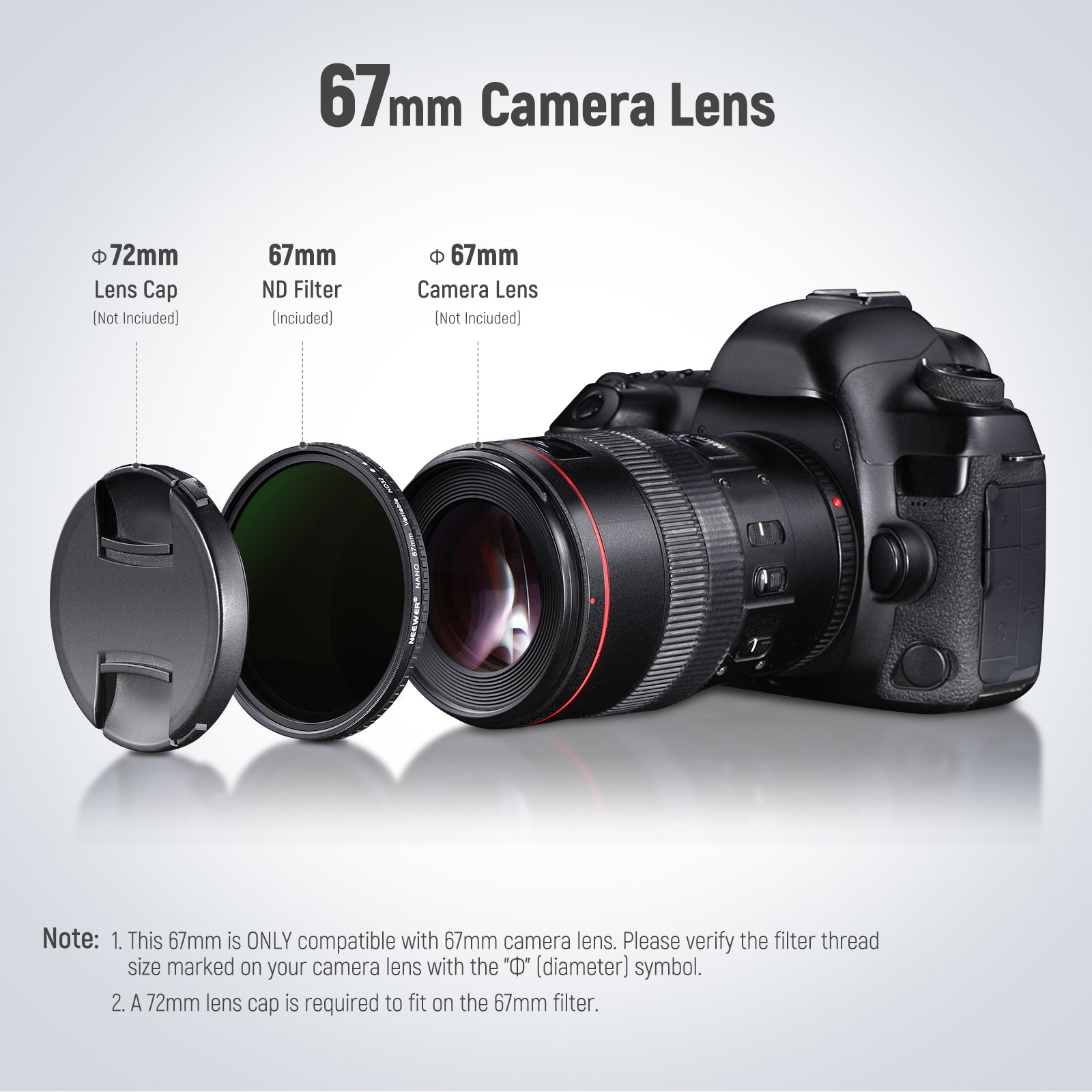 - Acerca de su compatibilidad : este filtro ND solo se adapta a lentes de cámara del mismo tamaño. Confirme el tamaño de la rosca del filtro marcado en su cámara con el símbolo "Ф" (diámetro) antes de realizar el pedido. Cuando se monta en la cámara, el filtro ND también protege la lente de la cámara contra rasguños. También se incluyen una funda protectora y un paño de limpieza.