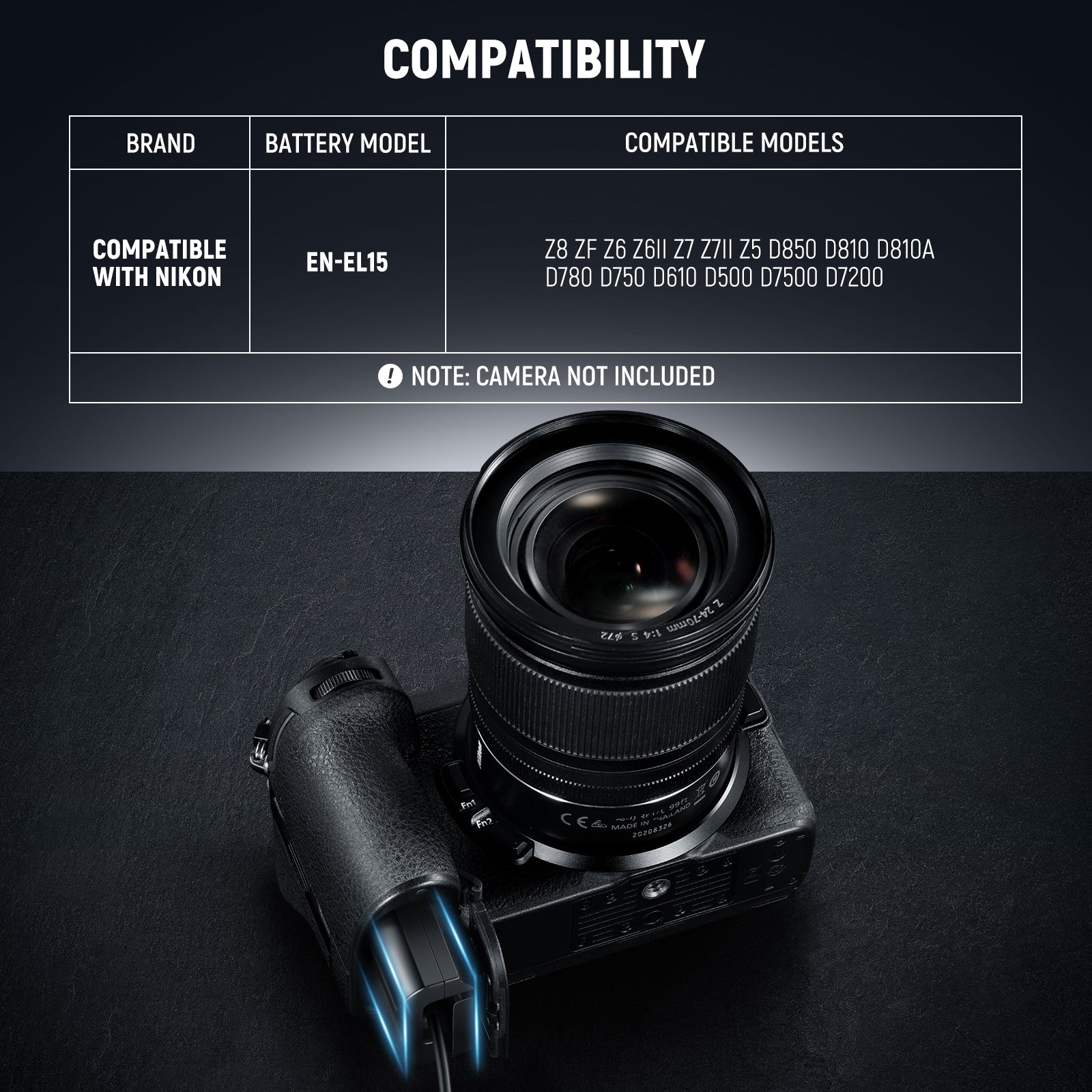 - Modelos de dispositivos compatibles : esta batería ficticia es una batería de repuesto para Nikon EN-EL15 y es totalmente compatible con las cámaras Nikon Z8 Zf Z6 Z6II Z7 Z7II Z5 D850 D810 D810A D780 D750 D610 D500 D7500 D7200 que aceptan baterías EN-EL15 EN-EL15a EN-EL15b EN-EL15c