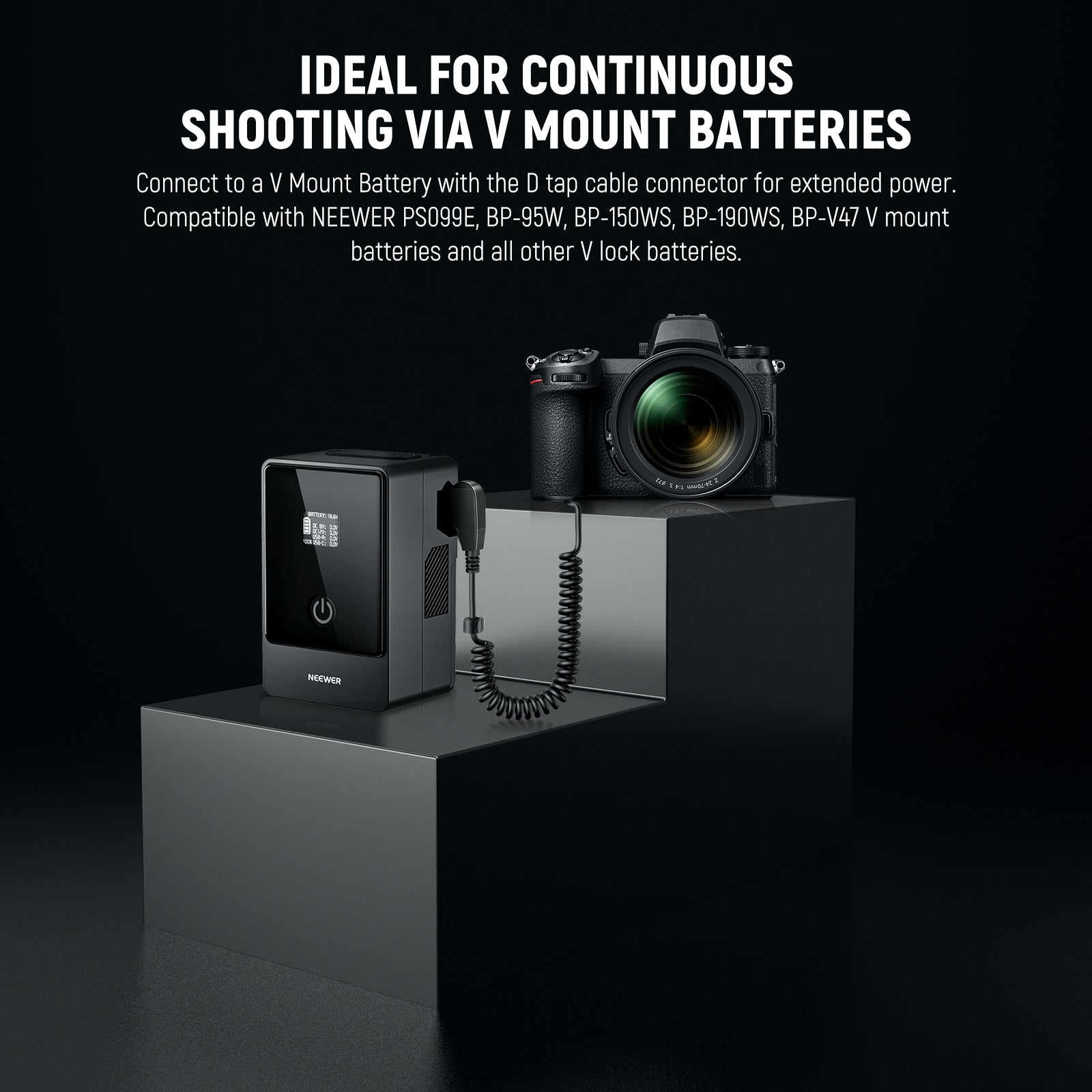 - Ideal para disparo continuo con baterías de montura V : con un conector de cable D-Tap, es compatible con las baterías de montura V NEEWER PS099E, BP-95W, BP-150WS, BP-190WS, BP-V47 y todas las demás baterías de montura V. Compatible con la serie de baterías de montura V SmallRig y con las baterías de montura V Sony BP-U65, BP-U68, BP-U100 y BP-U90.