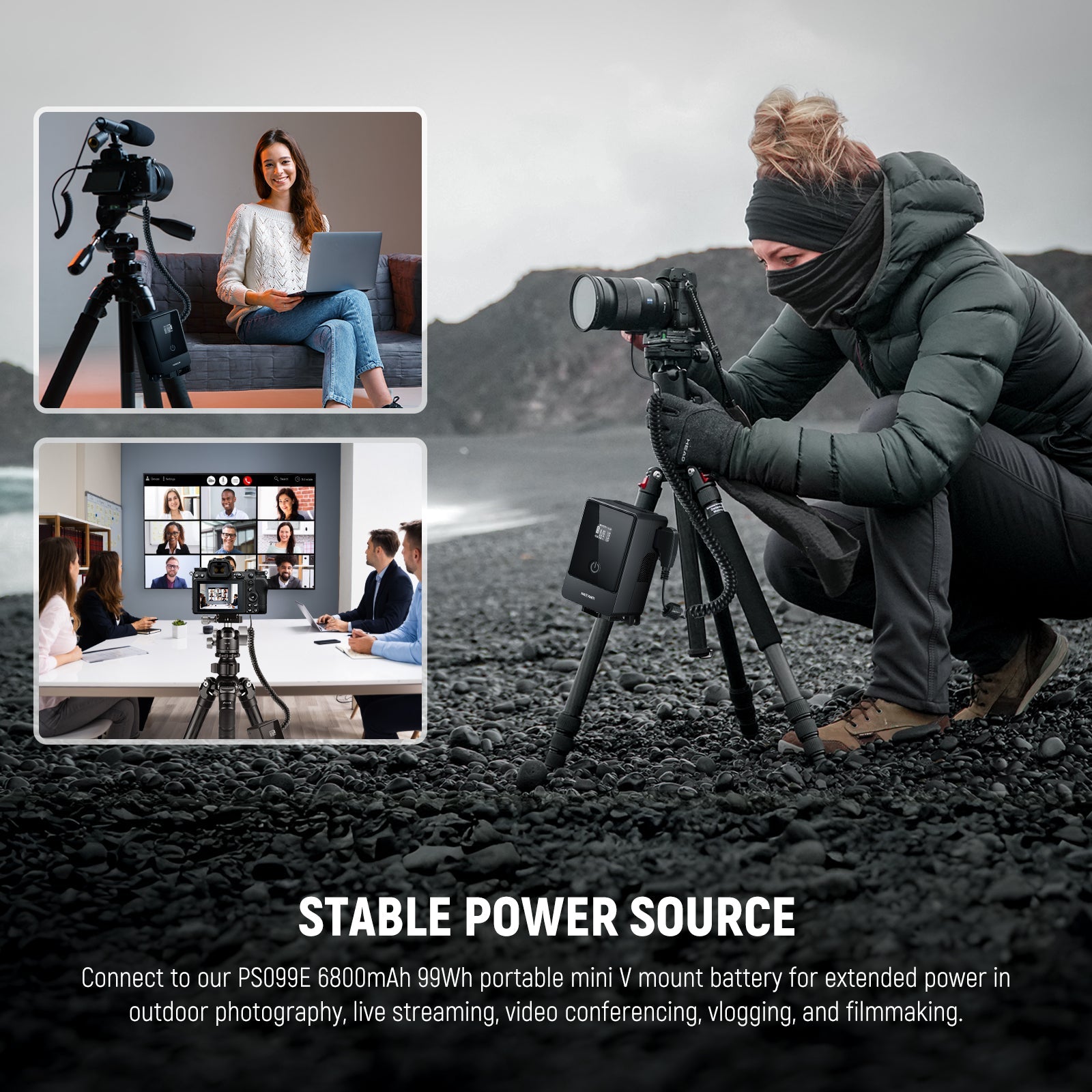 - Energía estable para grabaciones más largas y seguras : Dile adiós a los fallos de cable y protege tus grabaciones más importantes. Nuestro chip inteligente garantiza una alimentación constante y estable para tus creaciones. Conéctala a nuestra batería portátil PS099E de 6800 mAh y 99 Wh con mini montura en V para disfrutar de mayor potencia en fotografía al aire libre, streaming en directo, videoconferencias, vlogs y cine.