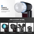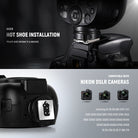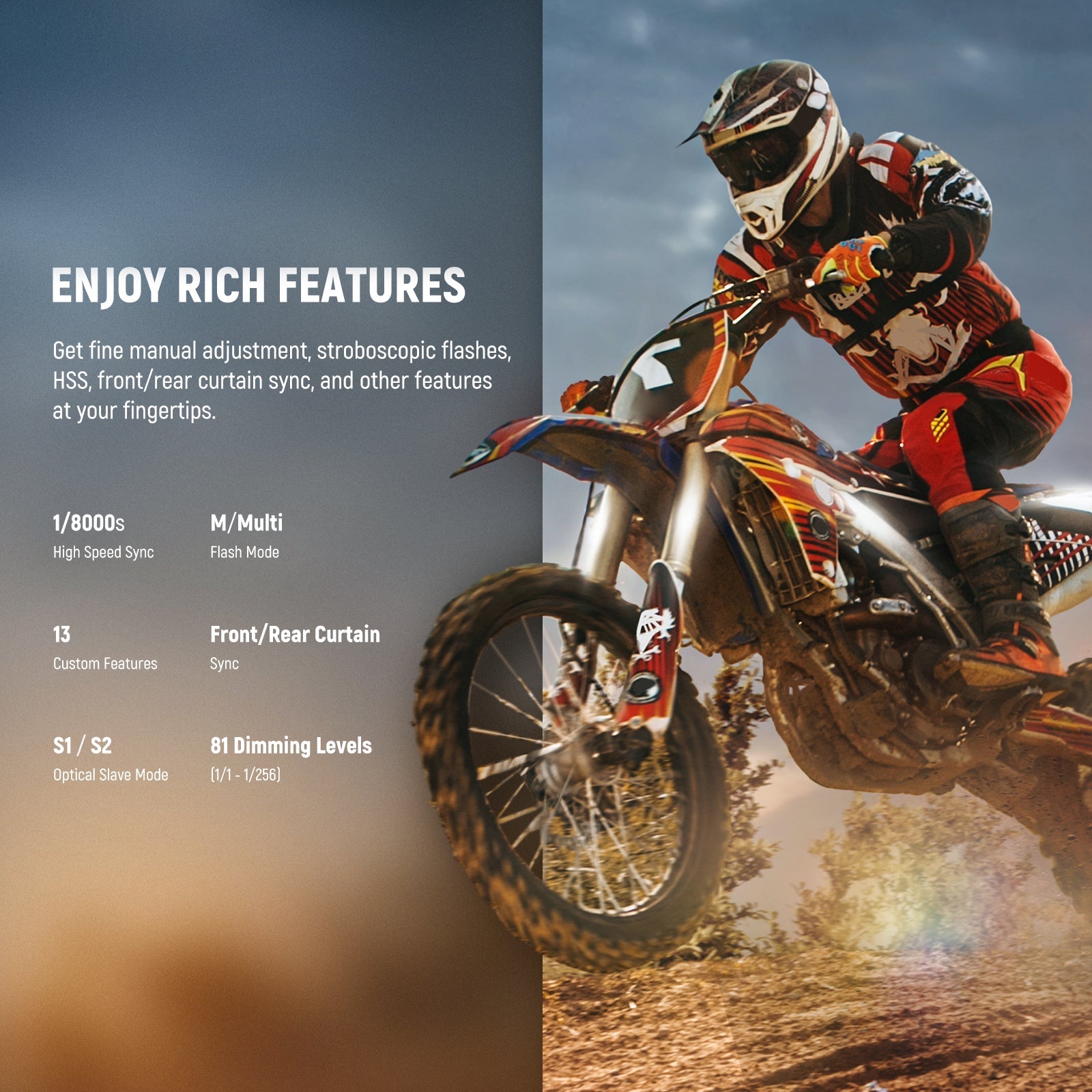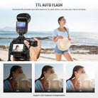 - Rendimiento avanzado : equipado con una potente salida de 76 W, ofrece modos de flash automático TTL, flash manual, flash estroboscópico y esclavo óptico (S1/S2). Con sincronización de alta velocidad de hasta 1/8000s y opciones de sincronización de primera/segunda cortina, proporciona un control preciso sobre la iluminación. Disfrute de funciones adicionales como compensación de exposición con flash (FEC), horquillado de exposición con flash (FEB), bloqueo de exposición con flash (FEL) y más