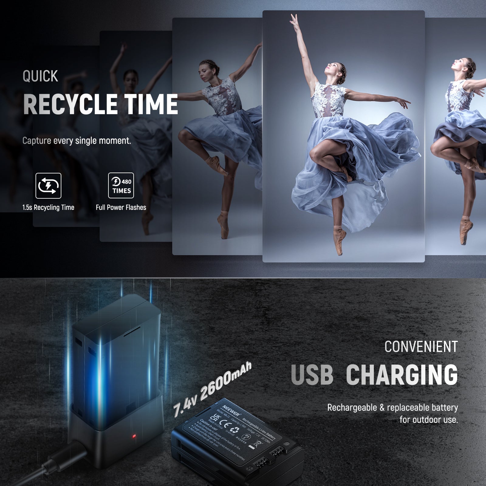 - Batería de alta capacidad y rebote flexible : la batería de litio de 7,4 V y 2600 mAh (NB-Z1) proporciona 480 flashes a máxima potencia, un tiempo de reciclaje rápido de 1,5 s y una duración del flash de entre 1/180 s y 1/20 000 s, lo que garantiza una experiencia de disparo mejorada. El cabezal del flash permite un ajuste horizontal de 0° a 330° y un ajuste vertical de -7° a 120°, lo que brinda una versatilidad de disparo incomparable
