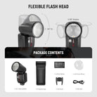 - Difusor de cúpula magnética y ángulos flexibles : el flash de 76 W cuenta con un cabezal de flash Fresnel circular, con la ayuda del difusor de cúpula magnética incluido, que garantiza efectos de luz uniformes, suaves y naturales con una temperatura de color estable de 5600 K (±200 K). El cabezal del flash permite un giro de 0 a 330° y una inclinación de -7 a 120°, y ajusta de forma automática o manual la cobertura del flash para lentes de entre 28 y 105 mm. Dos lámparas de modelado LED mejoradas de 2 W y 3300 K (una debajo del cabezal del flash) ofrecen 10 niveles de brillo (01 a 10).