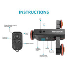 - Dolly con control remoto: Neewer Motorized Camera Dolly es una herramienta perfecta para grabar vídeos panorámicos, de lapso de tiempo y de ángulo bajo. Utilice el control remoto inalámbrico para establecer niveles de velocidad (1,4 cm/s, 2,4 cm/s, 3 cm/s), cambiar de dirección e iniciar/pausar la plataforma rodante hasta 19,7' (6 m) de distancia. Nota: habrá ruido durante el funcionamiento del carro motorizado cuando esté grabando audio.