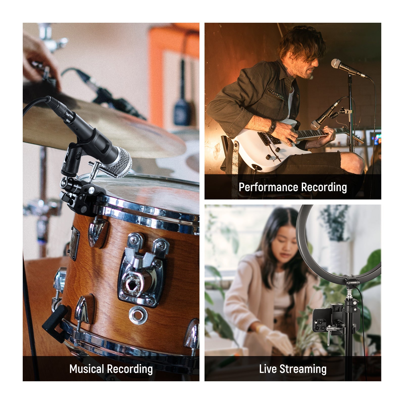 - Es ampliamente utilizado debido a su flexibilidad y versatilidad. La abrazadera podría usarse para conectar el trípode al micrófono. La abrazadera viene con una goma antideslizante en la mandíbula, que se monta firmemente en el escritorio, la tubería y la barra transversal y no los raspa. La apertura máxima de la abrazadera es de 52 mm/2,05" y se puede ajustar mediante la perilla de ajuste.