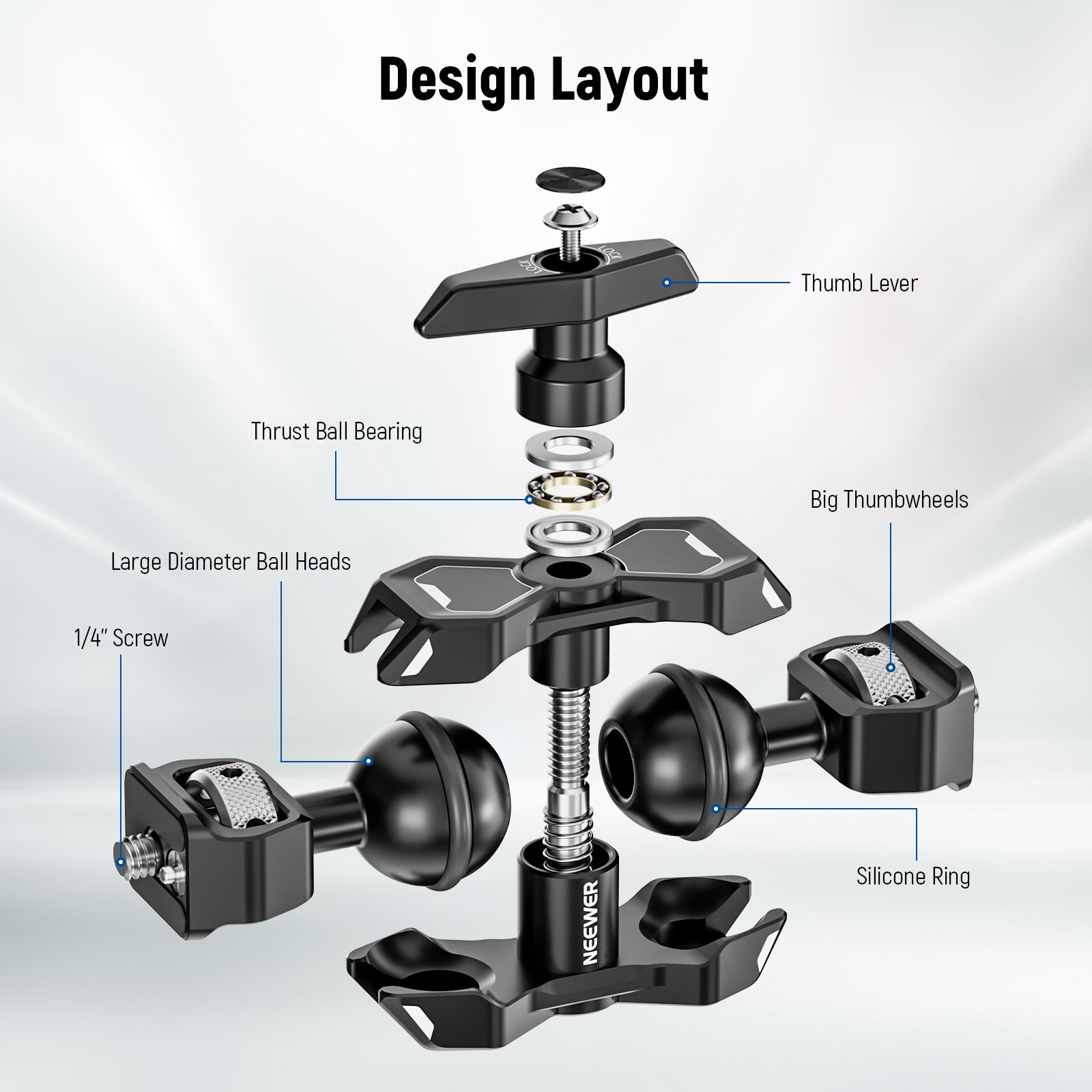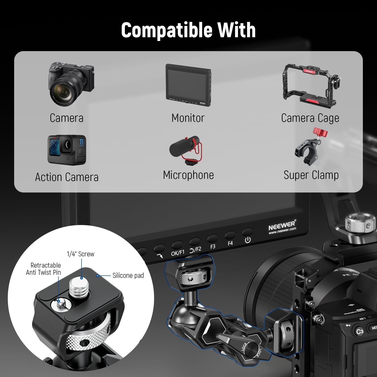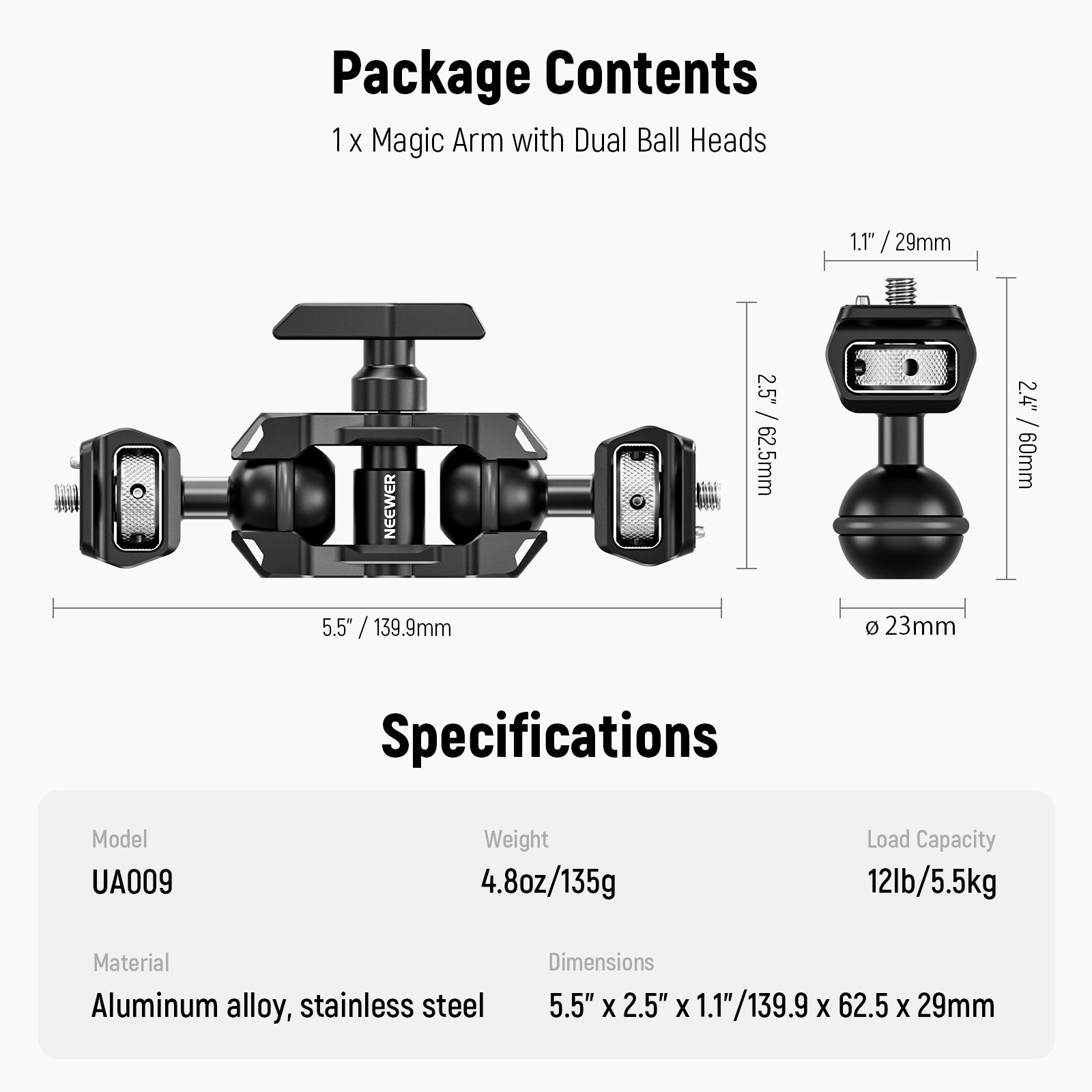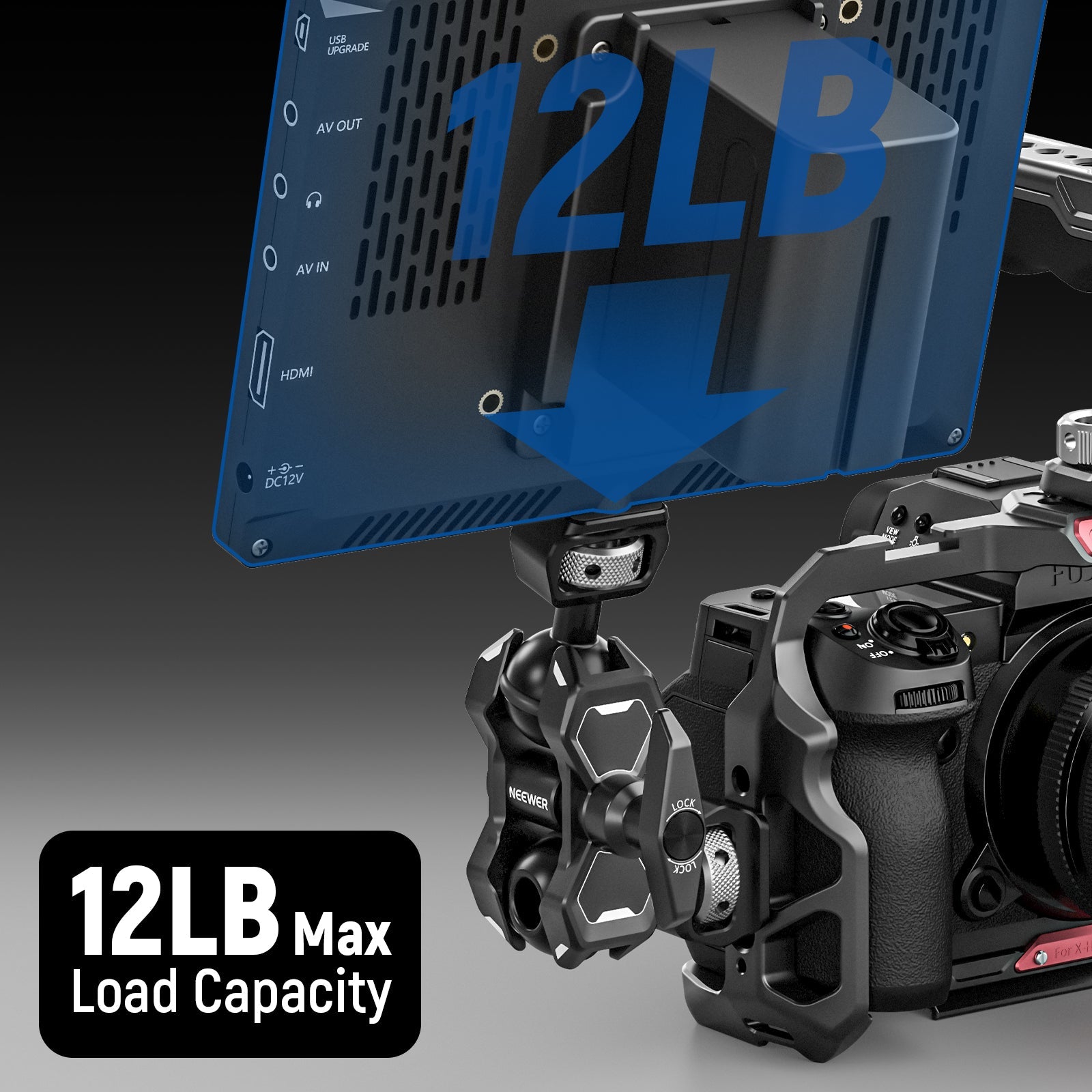 - Cabezales de bola dobles con tornillos de 1/4" : con una capacidad de carga máxima de 5,5 kg (12 lb), el brazo mágico con dos cabezales de bola roscados de 1/4" puede montar una cámara, un monitor de campo, un flash, una cámara de acción o un micrófono de forma segura.