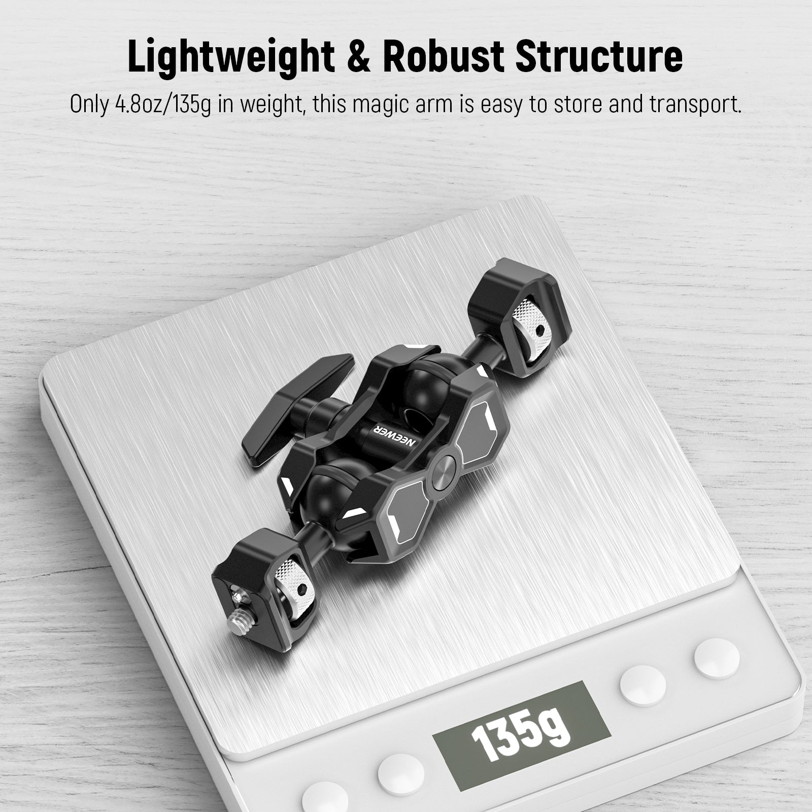 - Estructura liviana y robusta : con solo 135 g (4,8 oz) de peso, este brazo mágico es fácil de almacenar y transportar, ideal para fotografía al aire libre, realización de películas y vlogging. La sólida construcción de aleación de aluminio puede resistir la corrosión y los rayones.
