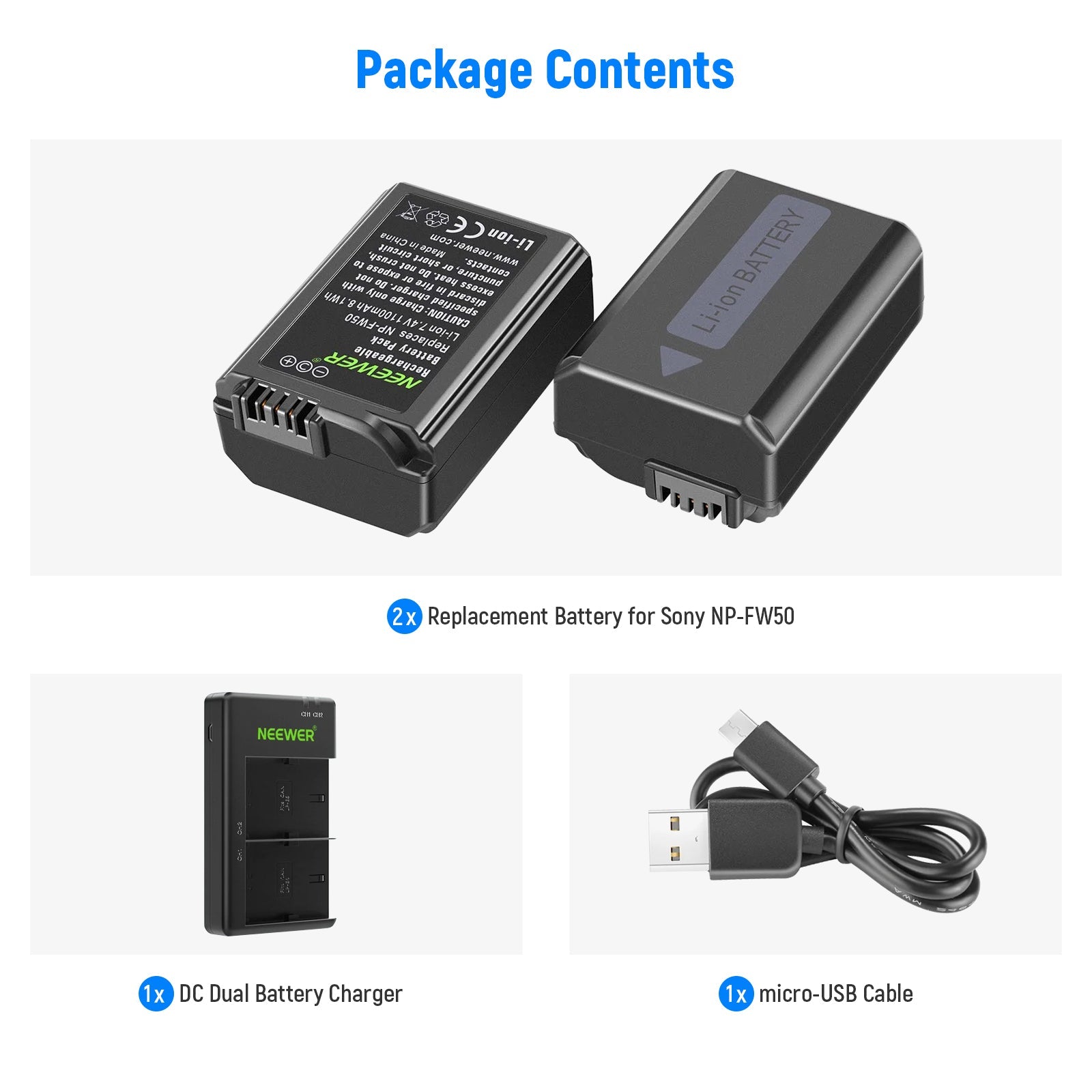 - Las baterías de repuesto más nuevas están fabricadas según las especificaciones exactas de la batería Sony NP-FW50 con una capacidad ligeramente mayor de 1100 mAh. Al igual que tu batería original, las Neewer también se pueden cargar dentro de tu cámara o con el cargador original. El cargador y la batería son completamente intercambiables.