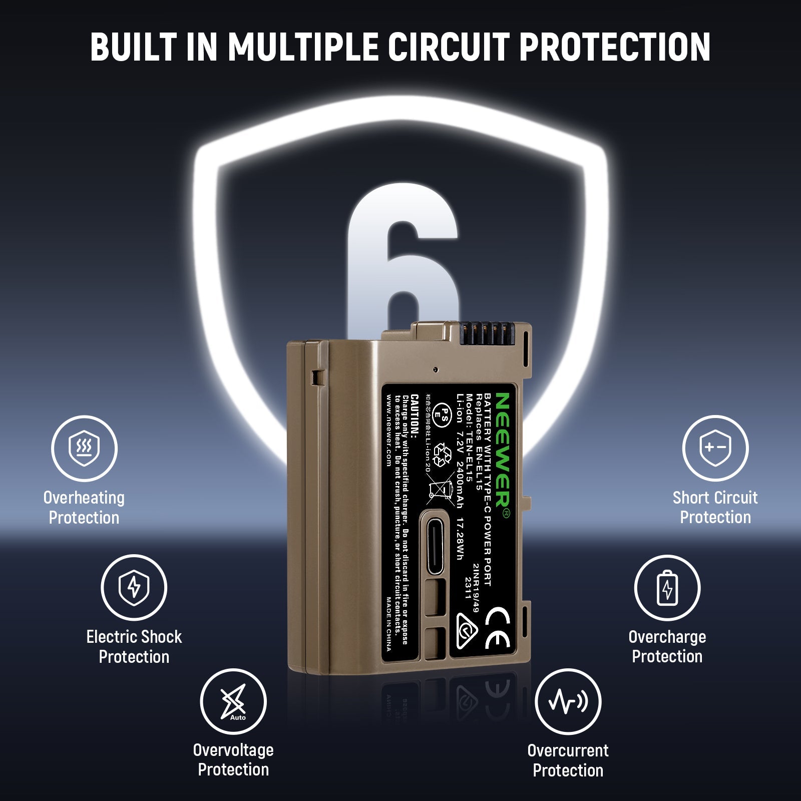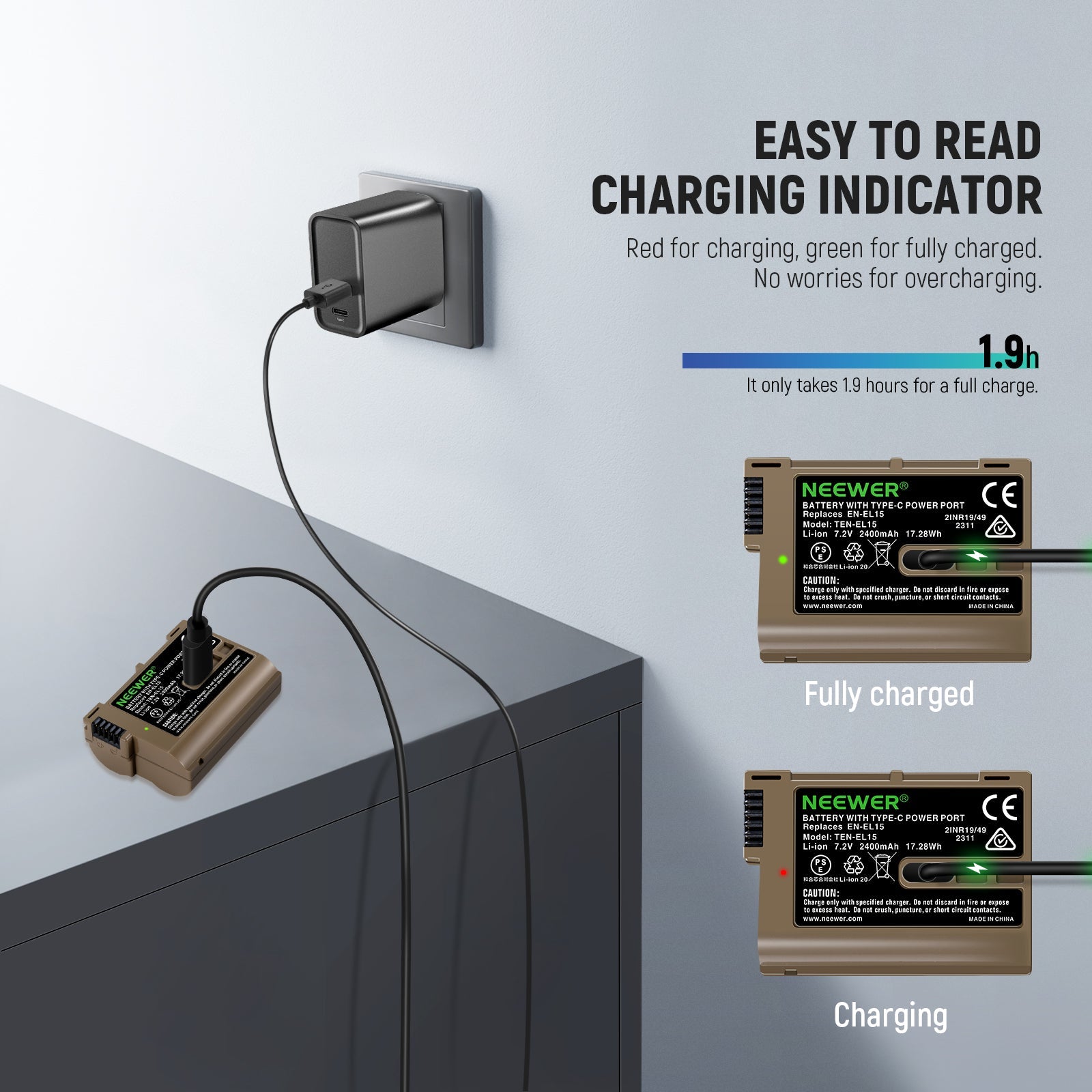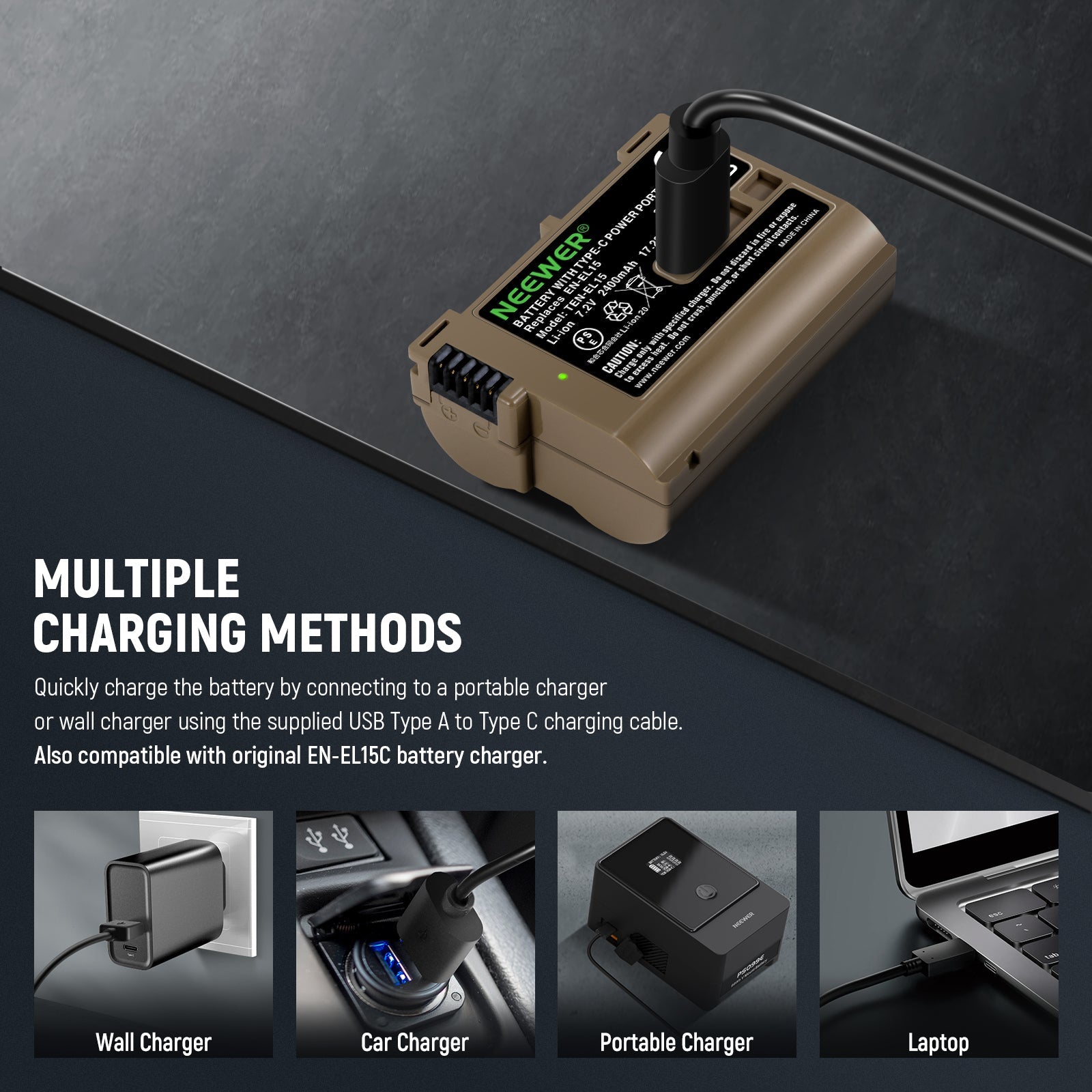 - Puerto USB tipo C integrado : diga adiós a los cargadores de baterías dedicados. Con un puerto de carga USB tipo C integrado, esta batería EN-EL15C de 2400 mAh (7,2 V 17,28 Wh) puede recibir energía directamente desde adaptadores de corriente y cargadores portátiles a través de un cable USB tipo C incluido.