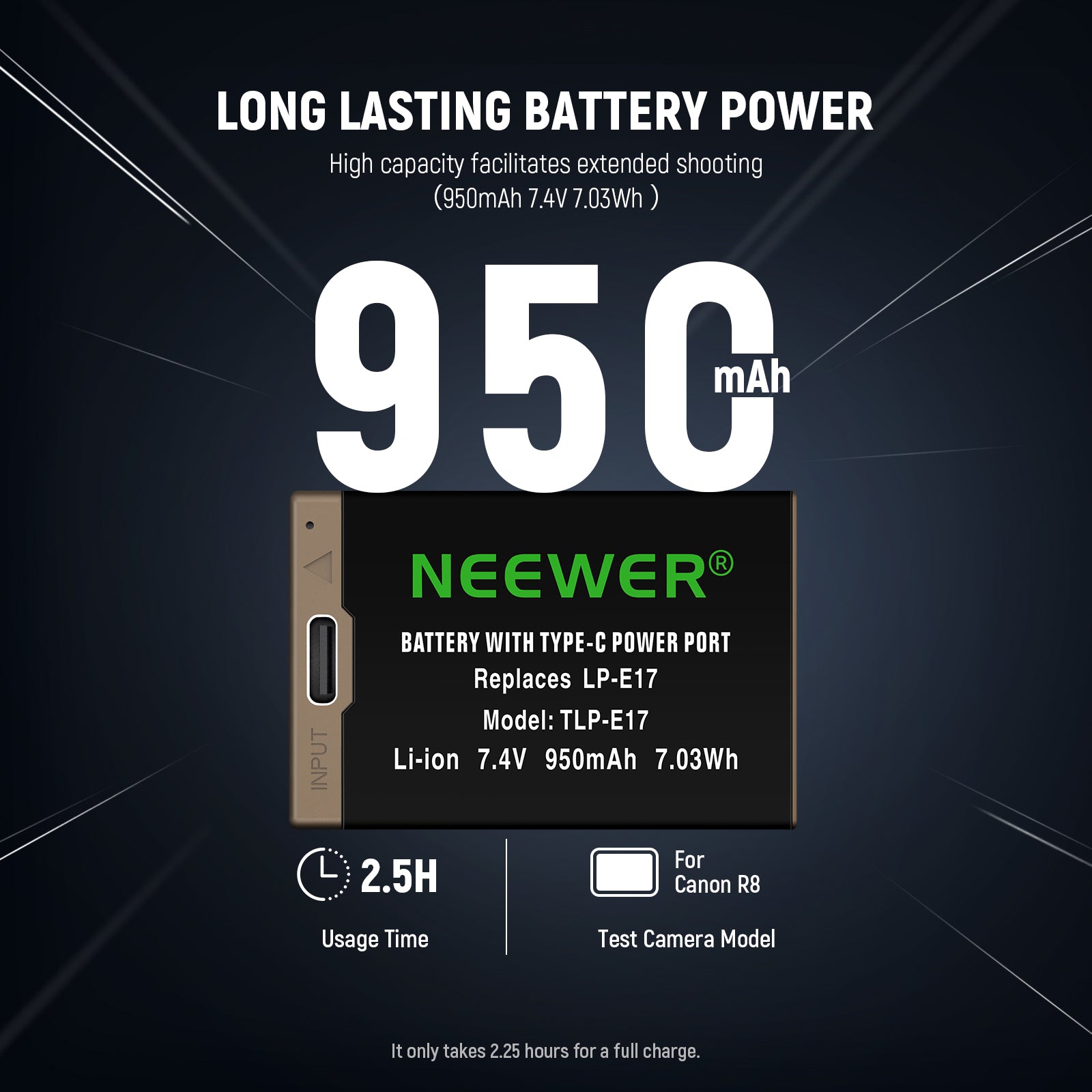 - Velocidad de carga rápida de 2,3 horas : esta batería de 950 mAh se puede cargar completamente en 2,3 horas con un cargador de pared USB de 5 V 2 A. Nota: No se admite la carga rápida PD. No compatible con el cargador de batería original LC-E17