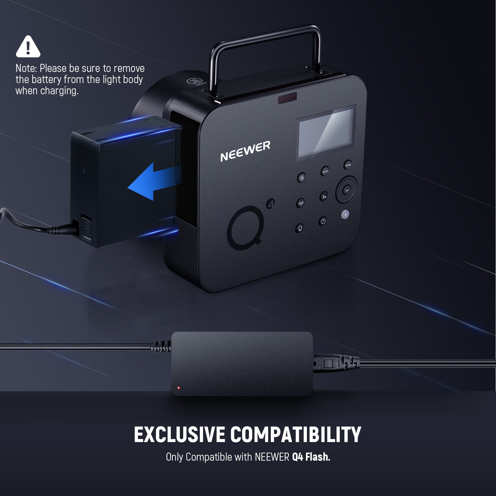 - Para NEEWER Q4 Strobe : compatible exclusivamente con NEEWER Q4 Flash Strobe para suministro de energía en interiores