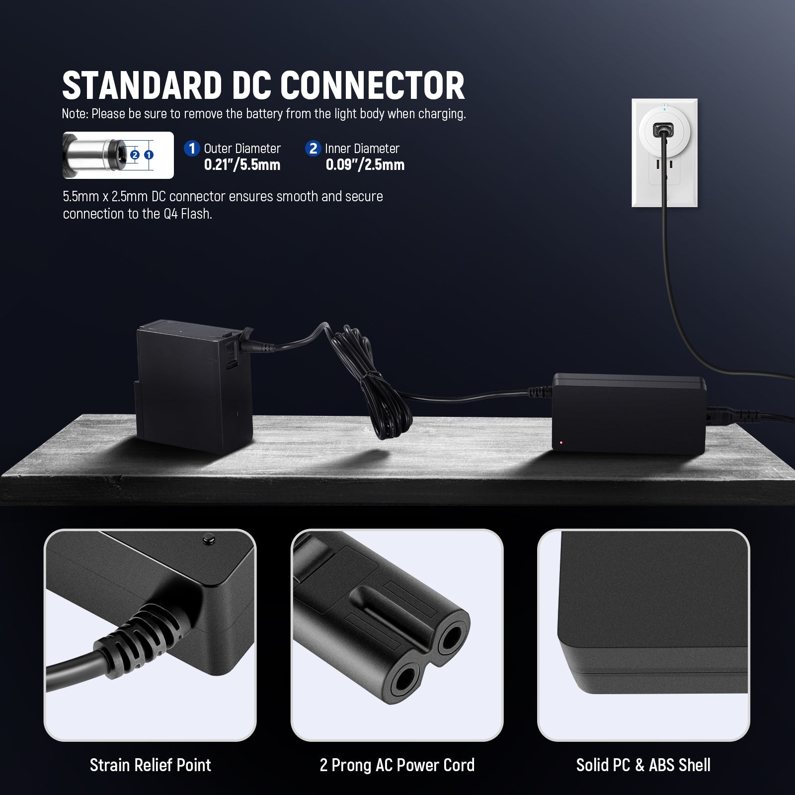 - Conector de CC estándar : el conector de CC de 5,5 mm x 2,5 mm garantiza una conexión suave y segura al Q4 Flash