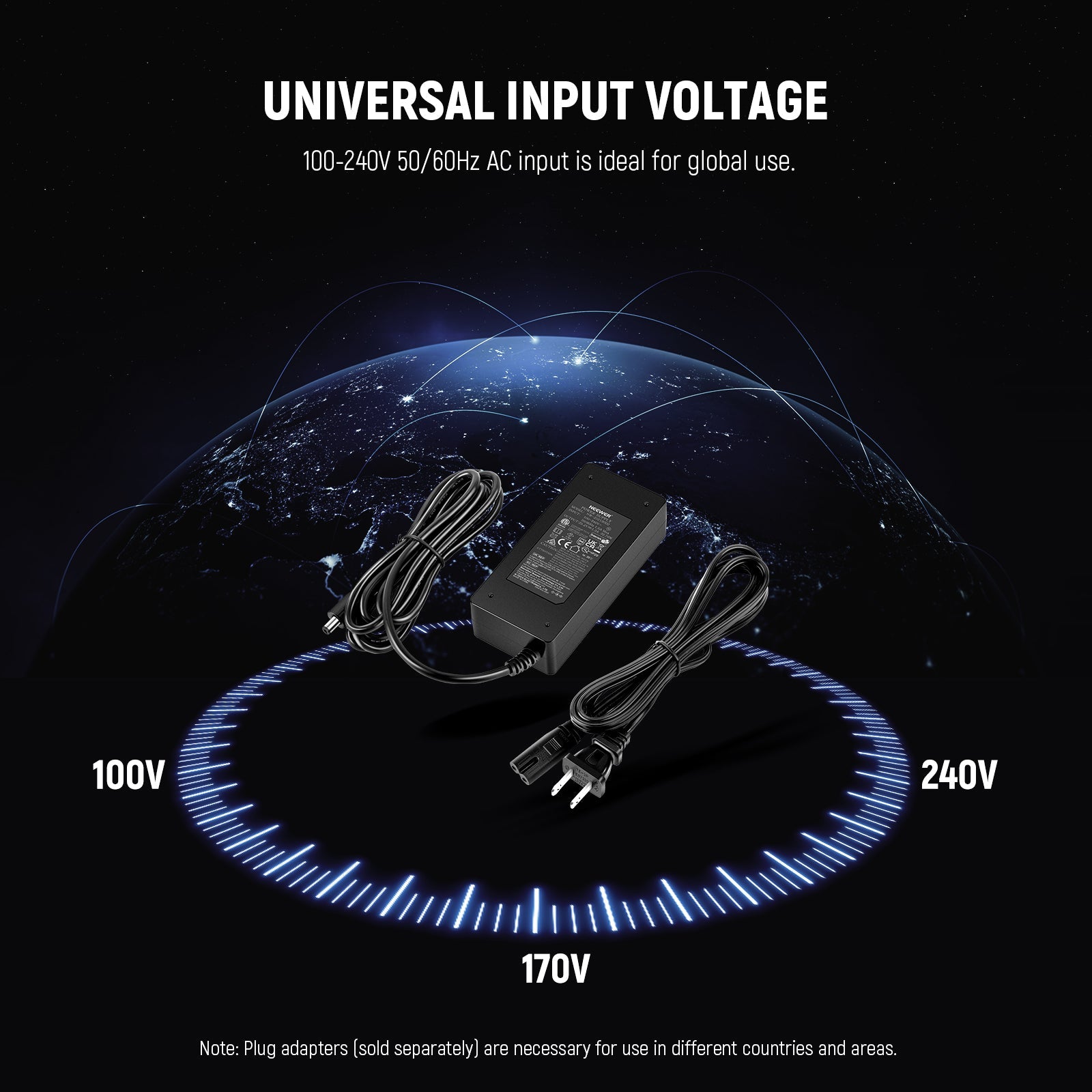 - Voltaje de entrada universal : la entrada de CA de 100-240 V 50/60 Hz es ideal para uso en todo el mundo. Nota: Se necesitan adaptadores de enchufe (se venden por separado) para usar en diferentes países y áreas.