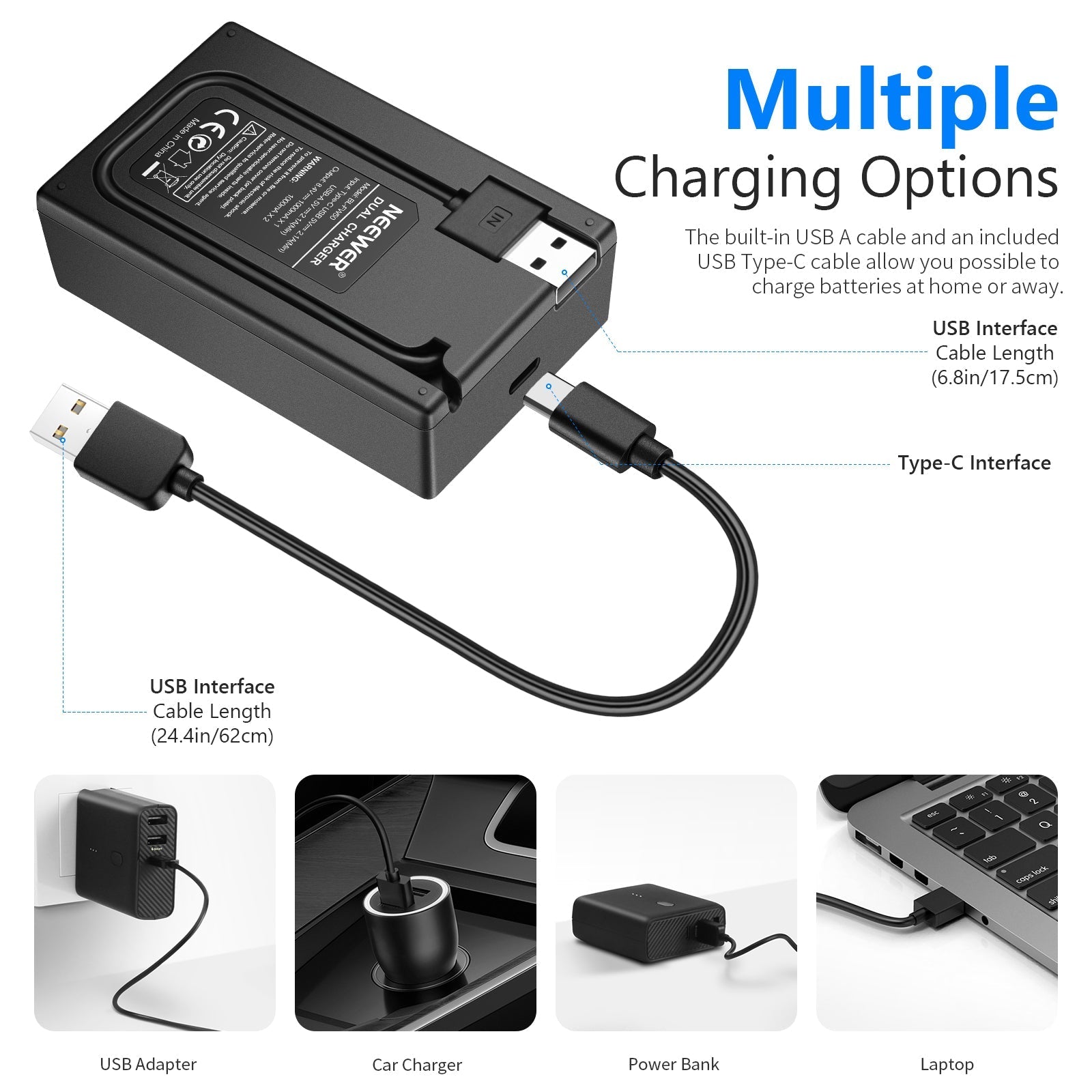 • Cómoda carga USB : el cargador USB de doble ranura puede cargar dos baterías al mismo tiempo. El cable de carga tipo C incluido ayuda a obtener energía de enchufes de pared, baterías externas, cargadores de automóvil y puertos USB de su computadora. La entrada de 8,4 V/1 A puede recargar las baterías al 100 % en solo unas horas.