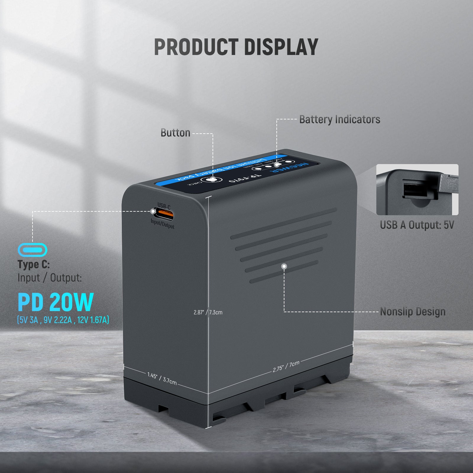 - Puertos duales y recarga sencilla : la batería NP-F970 está equipada con un puerto USB A y un puerto USB tipo C bidireccional. El puerto USB tipo C puede funcionar como entrada o salida y admite carga rápida PD de 20 W para cargar completamente la batería en 3,5 horas. El puerto USB A cuenta con una salida de 5V para cargar smartphones y tablets. Recarga la batería a través de enchufes de pared, cargadores de coche y cargadores portátiles