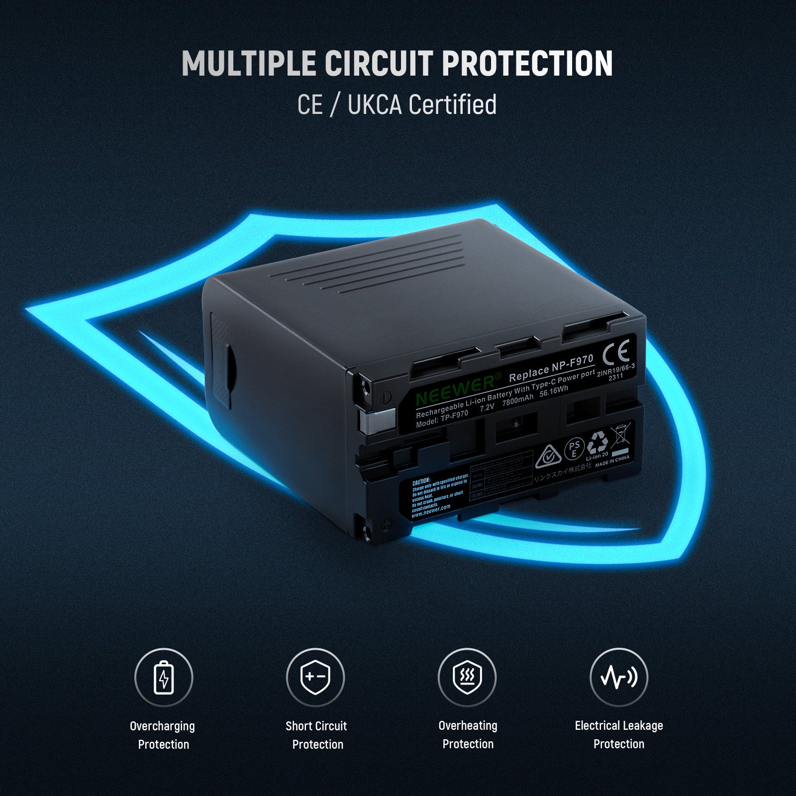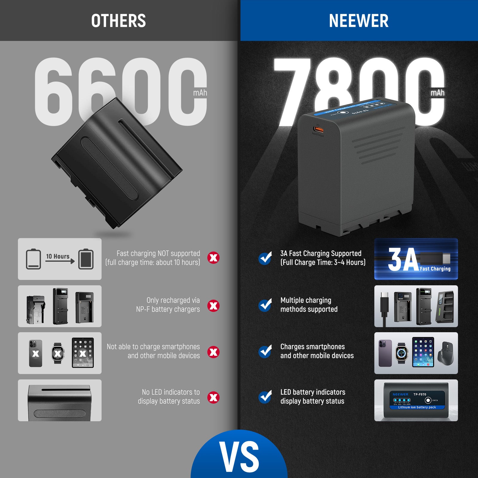 - Batería de repuesto mejorada de mayor capacidad : la batería de litio recargable NEEWER TP-970 presenta una alta capacidad (7,2 V, 7800 mAh, 56,16 Wh) y ofrece una duración de batería más larga que las baterías NP-F comunes. Fabricado con celdas de primera calidad, puede brindarle energía de batería abundante y constante para capturar cada momento maravilloso de la vida.