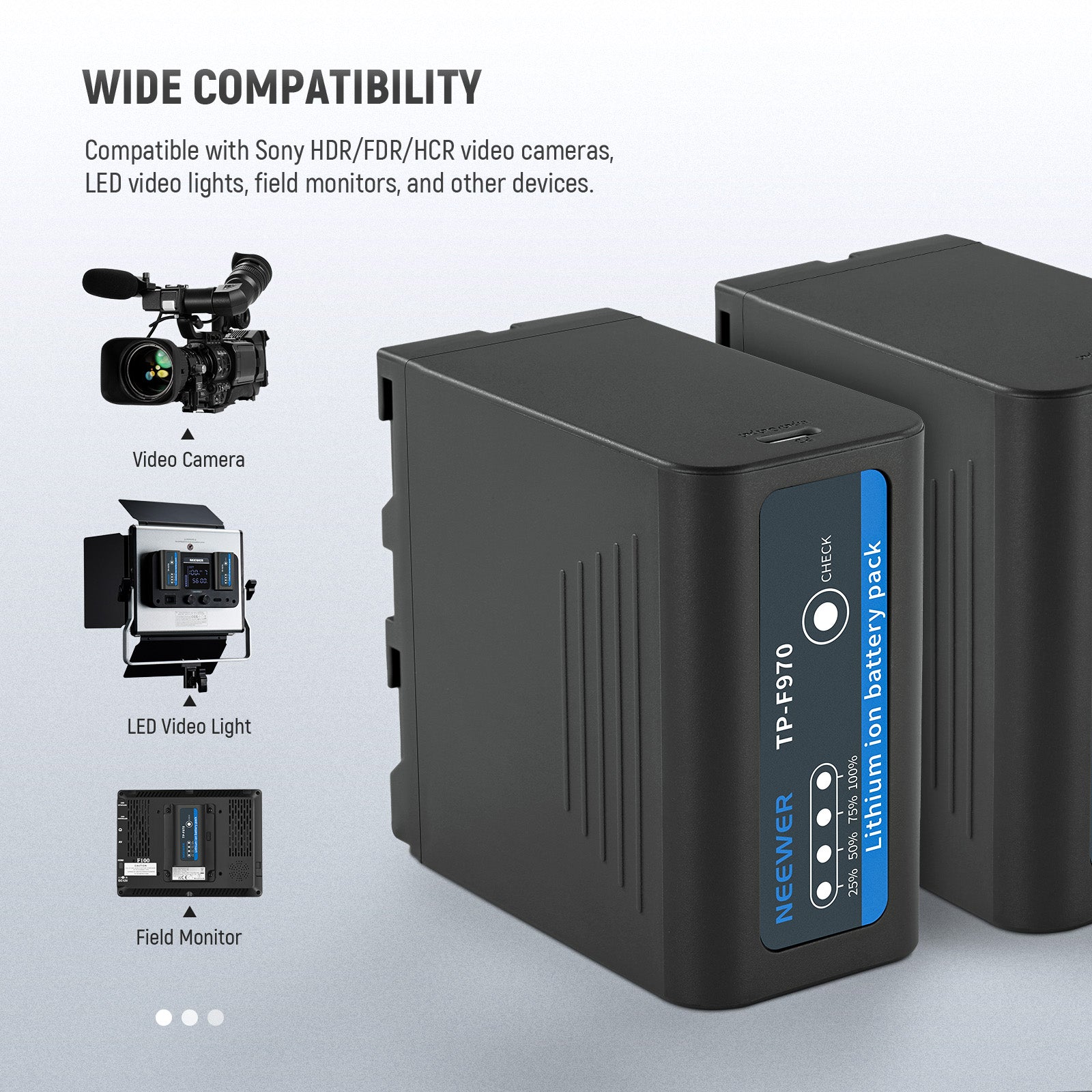 - Amplia compatibilidad : un reemplazo para todas las baterías de la serie NP-F, incluidas NP-F550 NP-F570 NP-F750 NP-F770 NP-F960 NP-F970 NP-F975. Compatible con cámaras y videocámaras Sony como CCD-RV CCD-SC CCD-TR CCD-TRT CCD-TRV CVX DSR DCR GV HDR HVL HVR MPK MVC PBD PLM, paneles de luces LED NEEWER, luces anulares y monitores de campo.
