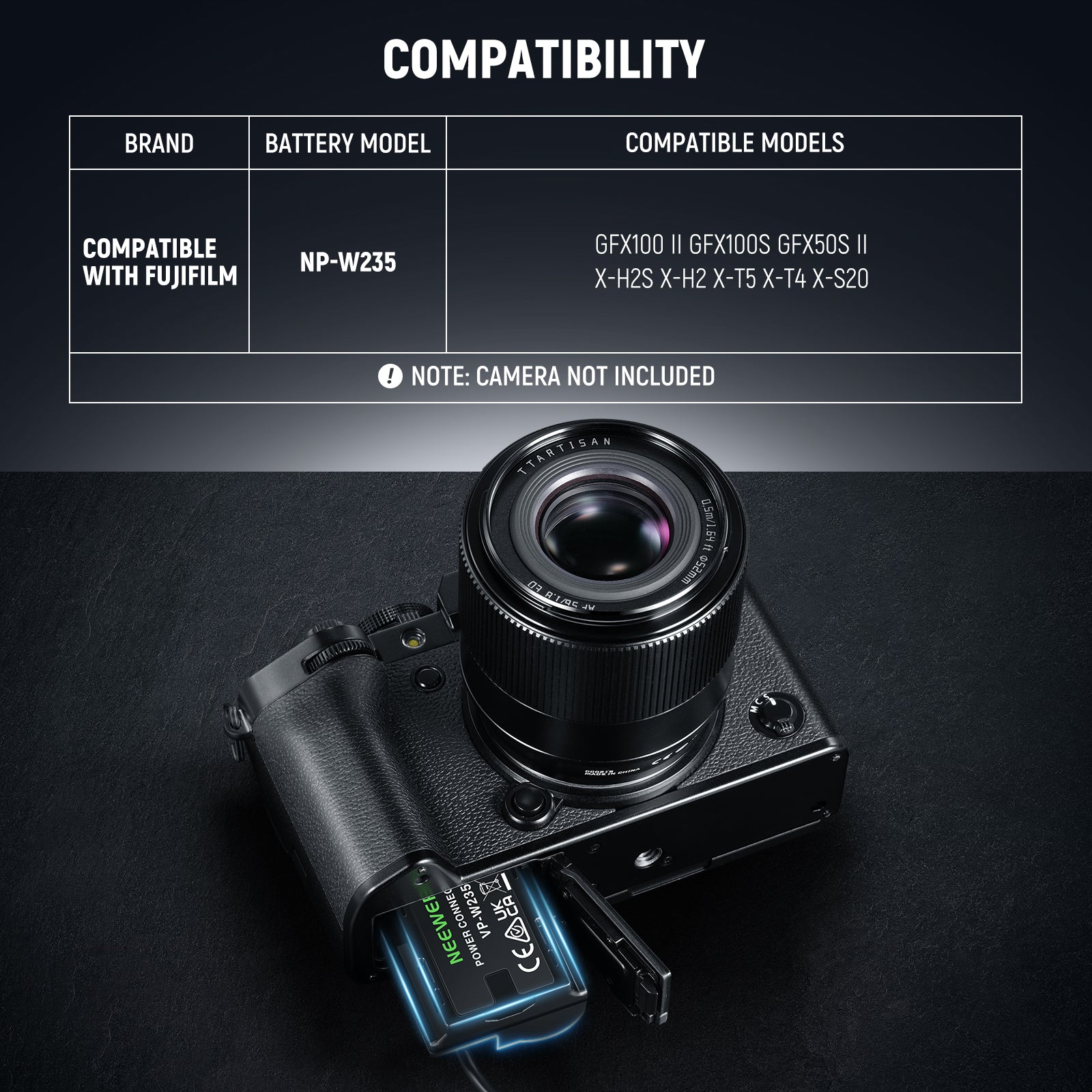 - Modelos de dispositivos compatibles : esta batería simulada es una batería de repuesto para Fujifilm NP-W235 y es totalmente compatible con las cámaras Fujifilm GFX100 II GFX100S GFX50S II X-H2S X-H2 X-T5 X-T4 X-S20.
