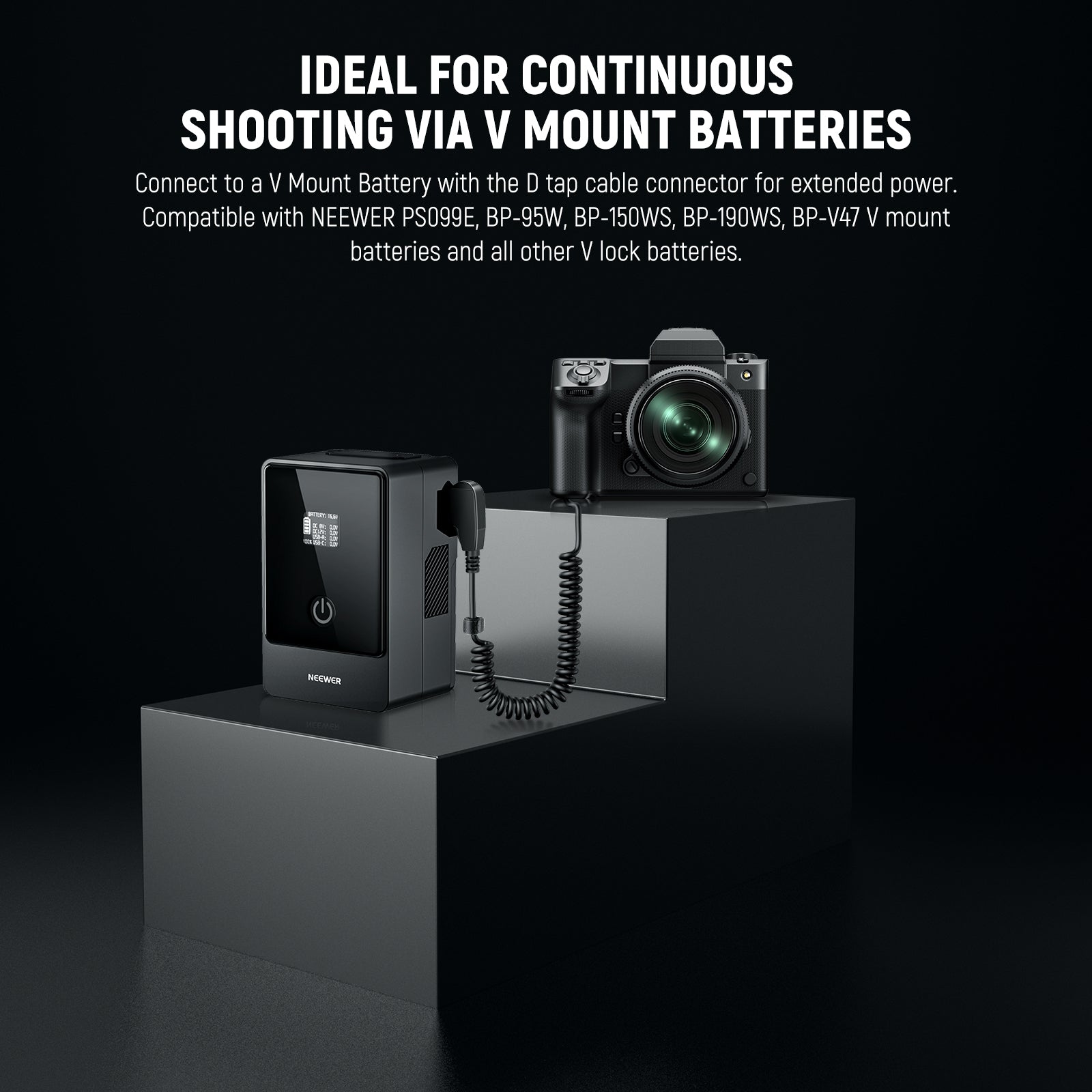 - Ideal para disparo continuo mediante baterías de montaje en V : con un conector de cable de grifo D, puede funcionar con baterías de montaje en V NEEWER PS099E, BP-95W, BP-150WS, BP-190WS, BP-V47 V y todas las demás baterías de bloqueo en V. Compatible con la serie de baterías SmallRig v mount, compatible con baterías Sony BP-U65 BP-U68 BP-U100 BP-U90 V
