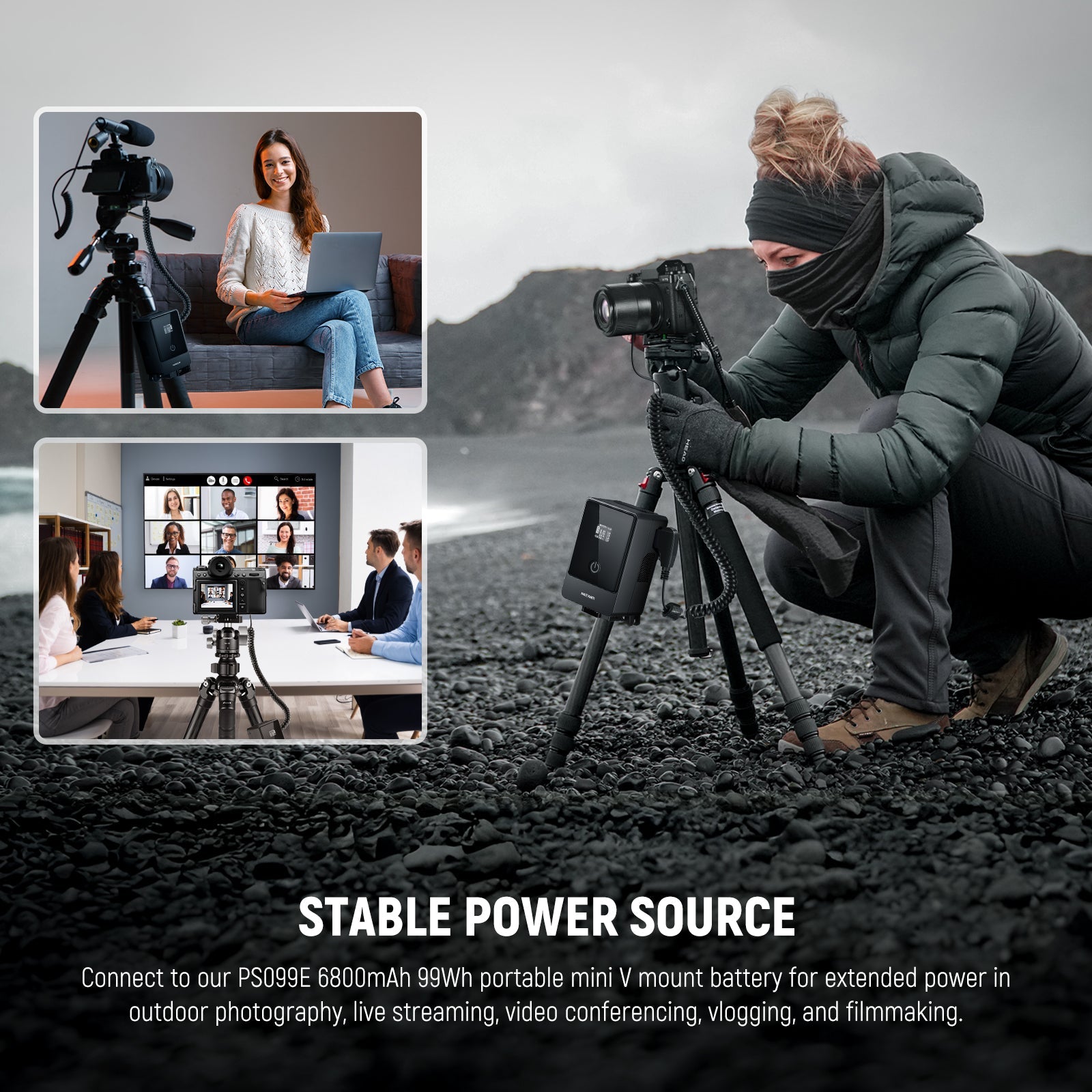- Energía estable para grabaciones más largas y seguras : diga adiós a las fallas de cables y proteja sus imágenes críticas. Nuestro chip inteligente garantiza un suministro de energía constante y estable para tu creación. Conéctese a nuestra batería portátil con montura mini V PS099E de 6800 mAh y 99 Wh para obtener energía extendida en fotografía al aire libre, transmisión en vivo, videoconferencias, vlogging y cine.
