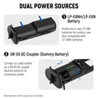 - Duración de batería doble : diseñada para sesiones de grabación prolongadas, la empuñadura de batería puede alojar hasta dos paquetes de baterías LP-E6N/LP-E6NH para una mayor duración de la batería. Para obtener alimentación continua, conecte la empuñadura de batería a una toma de pared mediante un acoplador de CC. Nota: Las baterías LP-E6N/LP-E6NH y el acoplador de CC se venden por separado