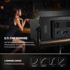 - 3 modos de iluminación : El AP100B ofrece 3 modos de iluminación: CCT, FX y SOURCE. En el modo CCT, puede ajustar la temperatura de color de 2500 K a 8500 K (en incrementos de 100 K). El modo FX cuenta con 13 efectos de escena, mientras que el modo SOURCE admite 14 fuentes de luz. Gracias a la tecnología PWM, la luz de filmación AP100B permite una atenuación precisa del 0 al 100 % en incrementos del 0,1 %. También ofrece 4 curvas de atenuación (exponencial, logarítmica, S y lineal) para diversas necesidades de iluminación.