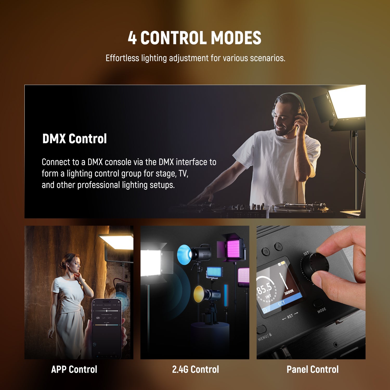 - Control APP/2.4G/Panel/DMX : 4 métodos de control para satisfacer tanto a profesionales como a principiantes. Control inalámbrico y gestión de múltiples grupos de luces fácilmente con la APP NEEWER; control de luces maestro y esclavo (AP150C, PL60C, FS300C, FS150C, RGB2, RGB1200, MS60C, MC60B, MS150B, FS150B, BH30S, CB60B, etc.) con el módulo 2.4G integrado; y ajuste fácilmente los parámetros con el panel con pantalla TFT a color. Un puerto DMX de 5 pines permite la conexión a una consola DMX para configuraciones complejas de múltiples luces.