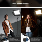 - Adaptador de CA o batería de montura V : Este equipo portátil de iluminación bicolor ofrece dos opciones de alimentación para uso en interiores y exteriores. En interiores, utilice el adaptador de CA de 20 V y el cable de alimentación incluidos. En exteriores, puede alimentarlo con una batería de montura V (14,8-26 V) y un cable D-Tap de 4 pines (la batería y el cable D-Tap se venden por separado), lo que garantiza una iluminación ininterrumpida para fotografía y videografía. El puerto de CC con bloqueo evita desconexiones accidentales durante el uso.