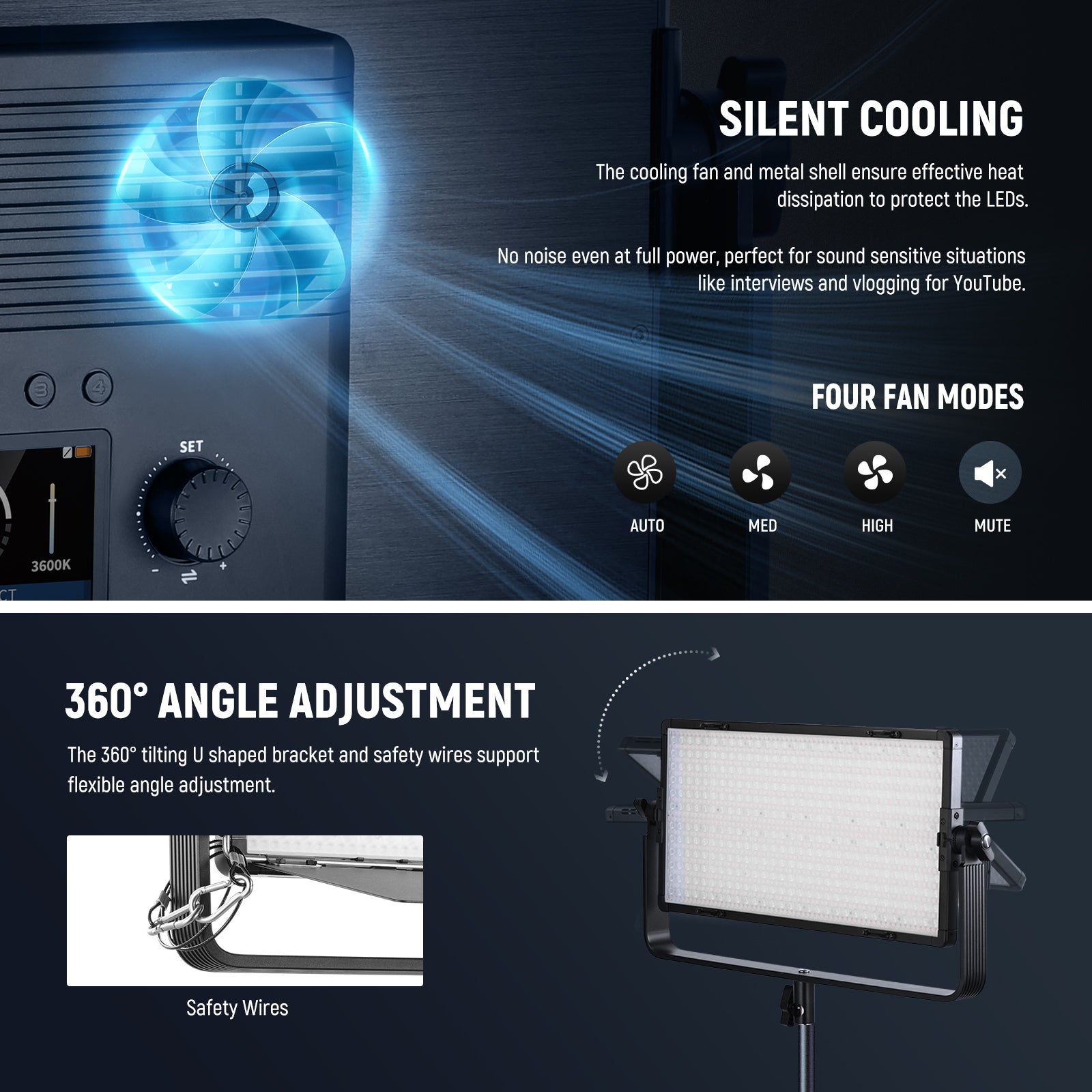 - Ventilador silencioso y modo FM inteligente : Esta luz cuenta con un sistema de refrigeración ultrasilencioso, optimizado para grabaciones en el set, que garantiza el 100 % de la potencia de salida y minimiza el ruido del ventilador. Ofrece los modos Inteligente, Medio, Alto y Silencioso para crear un entorno de grabación prácticamente silencioso. Su robusta carcasa metálica acelera la disipación del calor, prolongando así la vida útil de la luz. El modo FM inteligente integrado ajusta la frecuencia de la luz para evitar parpadeos durante grabaciones a alta velocidad.
