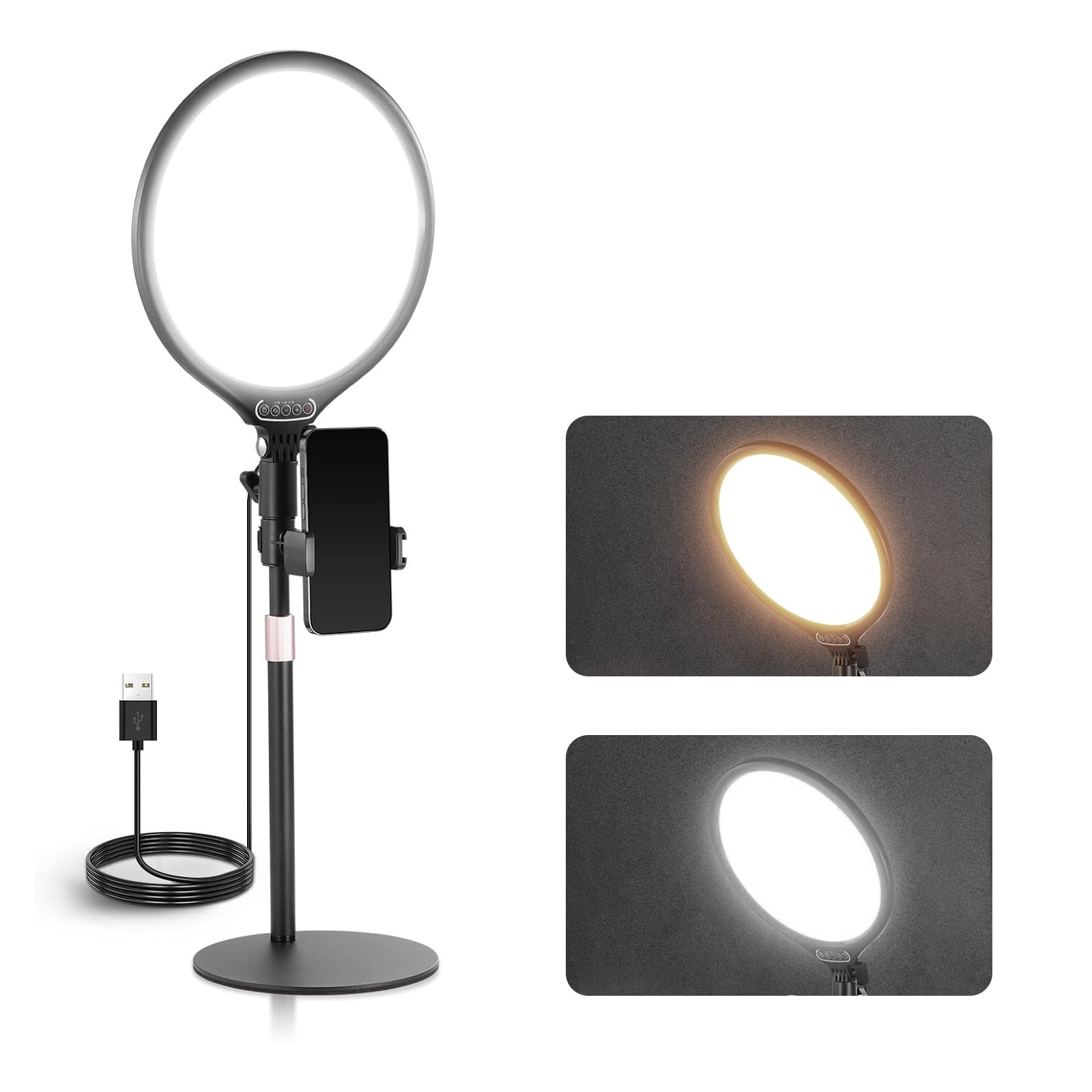 - Adjustable Lighting & Timer Function- This small portable desktop LED selfie ring light for photography with phone holder is essential and must have for content creators, streamers, and social media influencers, offering five color temperature levels, cycling through 3000K, 3200K, 4400K, 5600K, and 6500K, allowing you to achieve various lighting tones. Besides, brightness can be adjusted from 1% to 100%, with 2H/4H/8H timer settings, making it easy to customize your lighting as needed