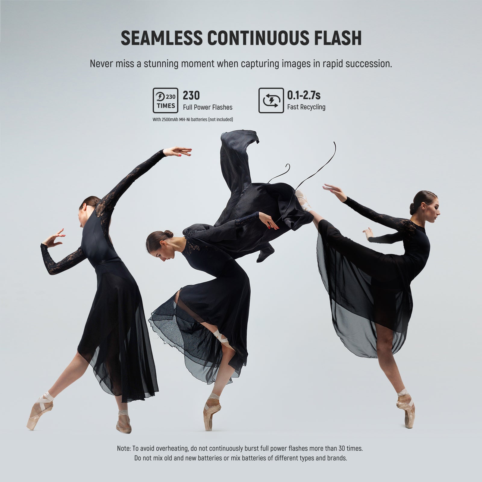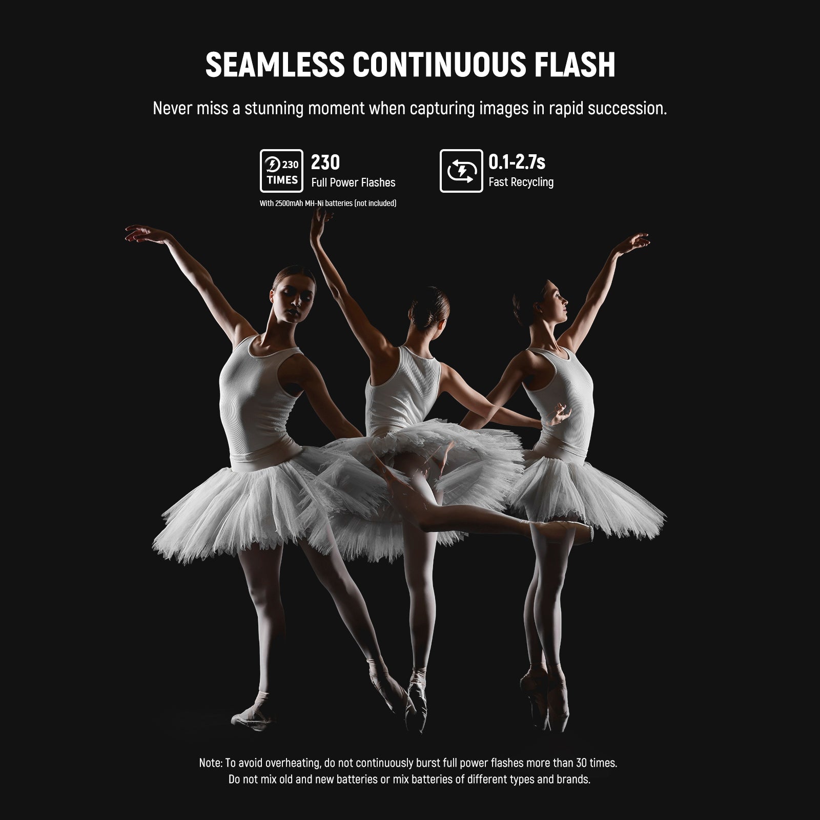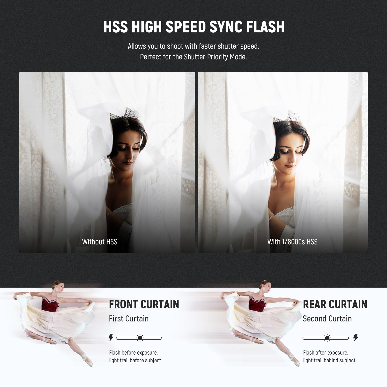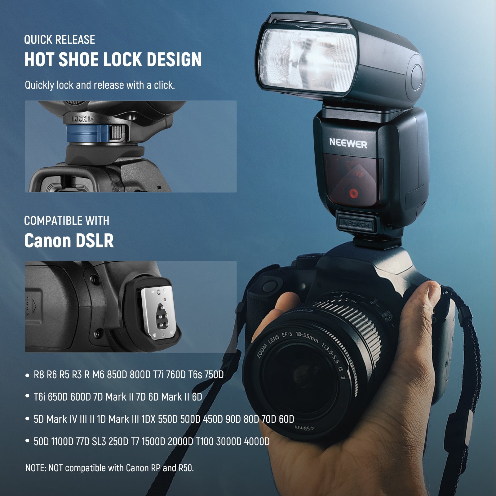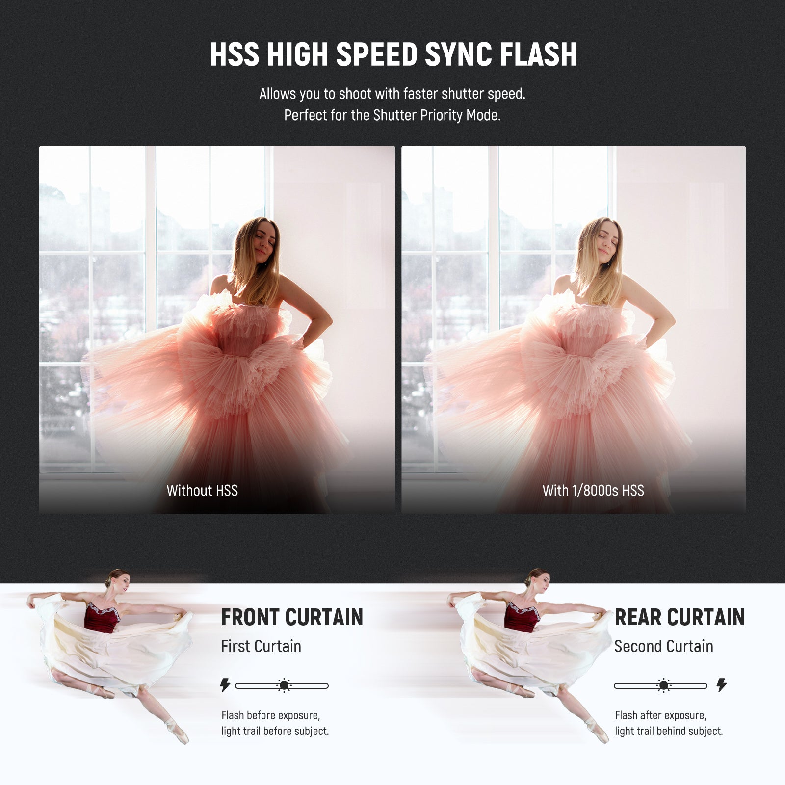 - Modos de flash TTL/M/MULTI : Incorpora modos E-TTL II (automático), M (manual) y MULTI (estroboscópico). El modo M admite 81 niveles de salida de flash (1/256-1/1) con un interruptor TCM para convertir rápidamente entre TTL y M. También admite sincronización de alta velocidad HSS de 1/8000 s, tiempo de reciclado de 0,1-2,7 s, duración del flash de 1/300 s-1/20 000 s, 100 destellos estroboscópicos (199 Hz), compensación de exposición del flash (FEC), horquillado de exposición del flash (FEB), bloqueo de exposición del flash (FEL), sincronización delantera/trasera y S1/S2 óptico.