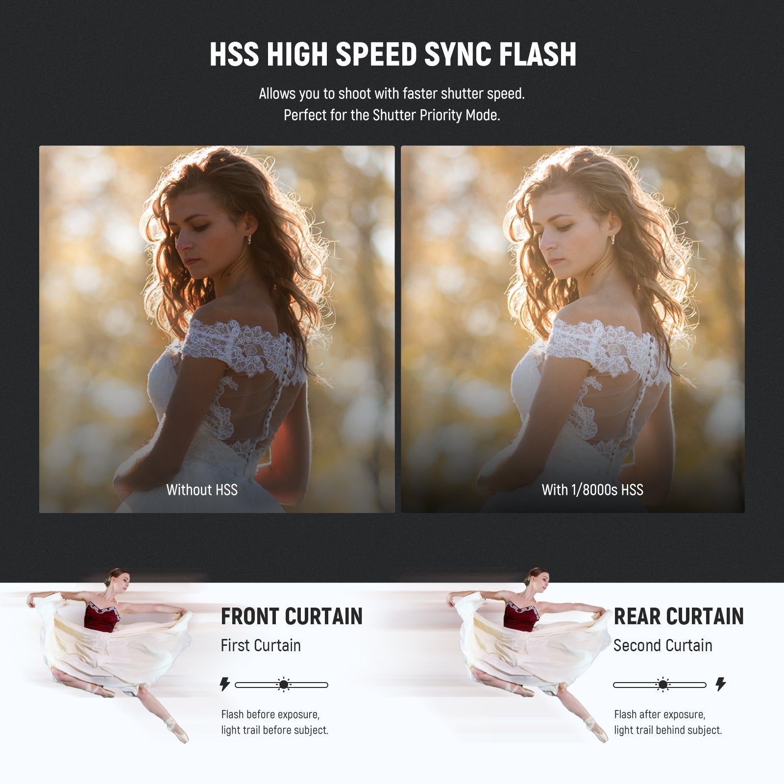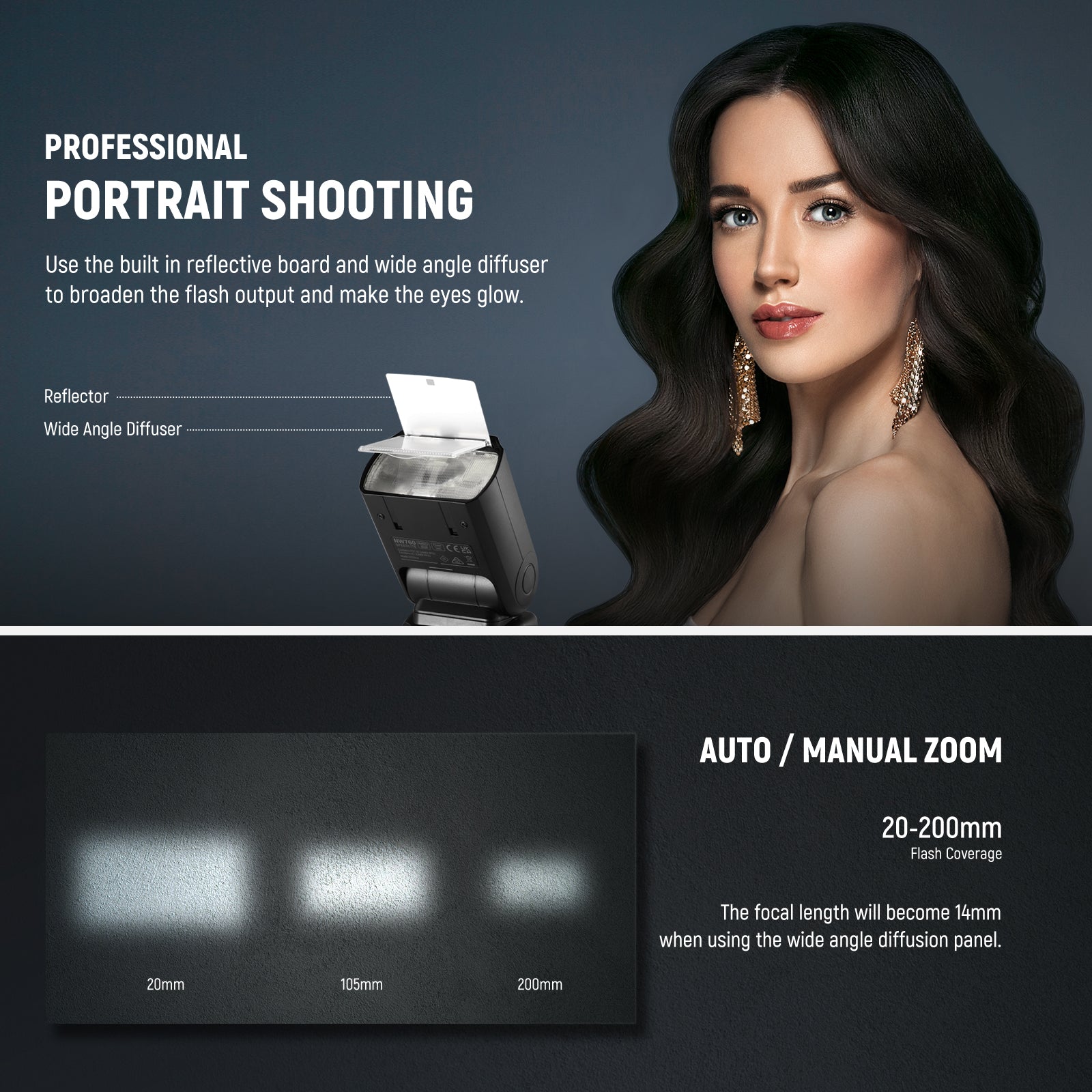 - Ángulos y efectos de flash flexibles : el cabezal del flash admite inclinaciones de -7° a 120° y rotación de 360° para rebotes y reflejos flexibles del flash. El reflector incluido y el panel difusor de ángulo amplio pueden hacer que los ojos brillen y ampliar la cobertura del flash para obtener un resultado suave y natural. La pantalla LCD HD permite la personalización, el modo de espera, el haz de asistencia de enfoque automático y la luz de fondo para un funcionamiento cómodo.