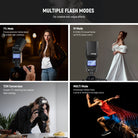 - Sistema Q inalámbrico 2.4G integrado : integrado con el sistema NEEWER 2.4GQ, el flash tiene 4 grupos maestros (A/B/C/D), 5 grupos esclavos (A/B/C/D/E, E para disparadores de la serie QPro), 32 canales (1-32) y 99 ID (1-99). Compatible con el disparador QPro-C TTL (se vende por separado) para control inalámbrico del flash. Puede funcionar como flash maestro/esclavo para controlar o ser controlado por otros flashes del sistema Q en un rango de 328'/100m (sin obstáculos) para diversos efectos.