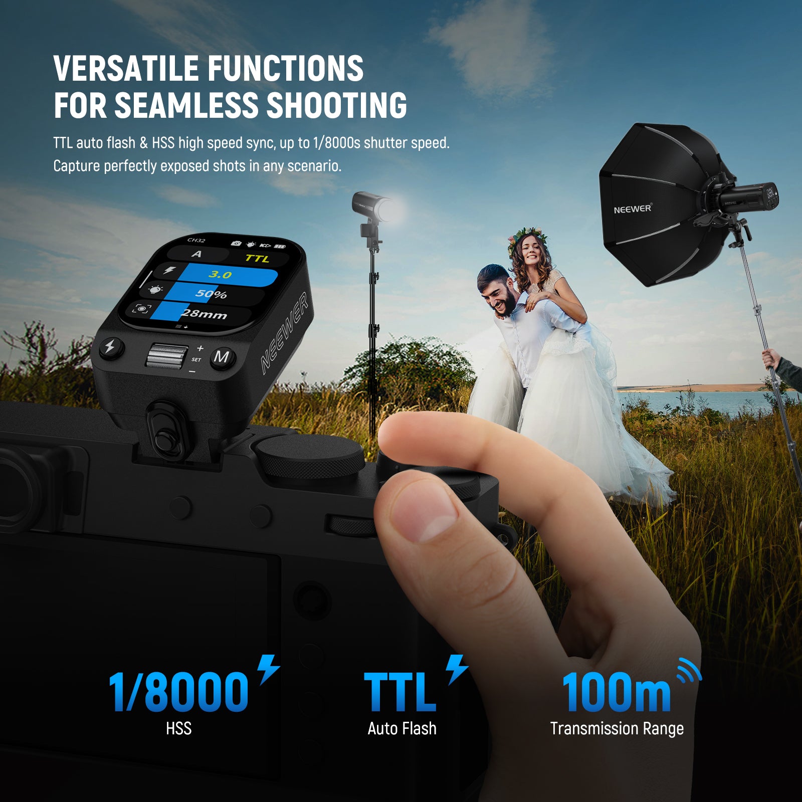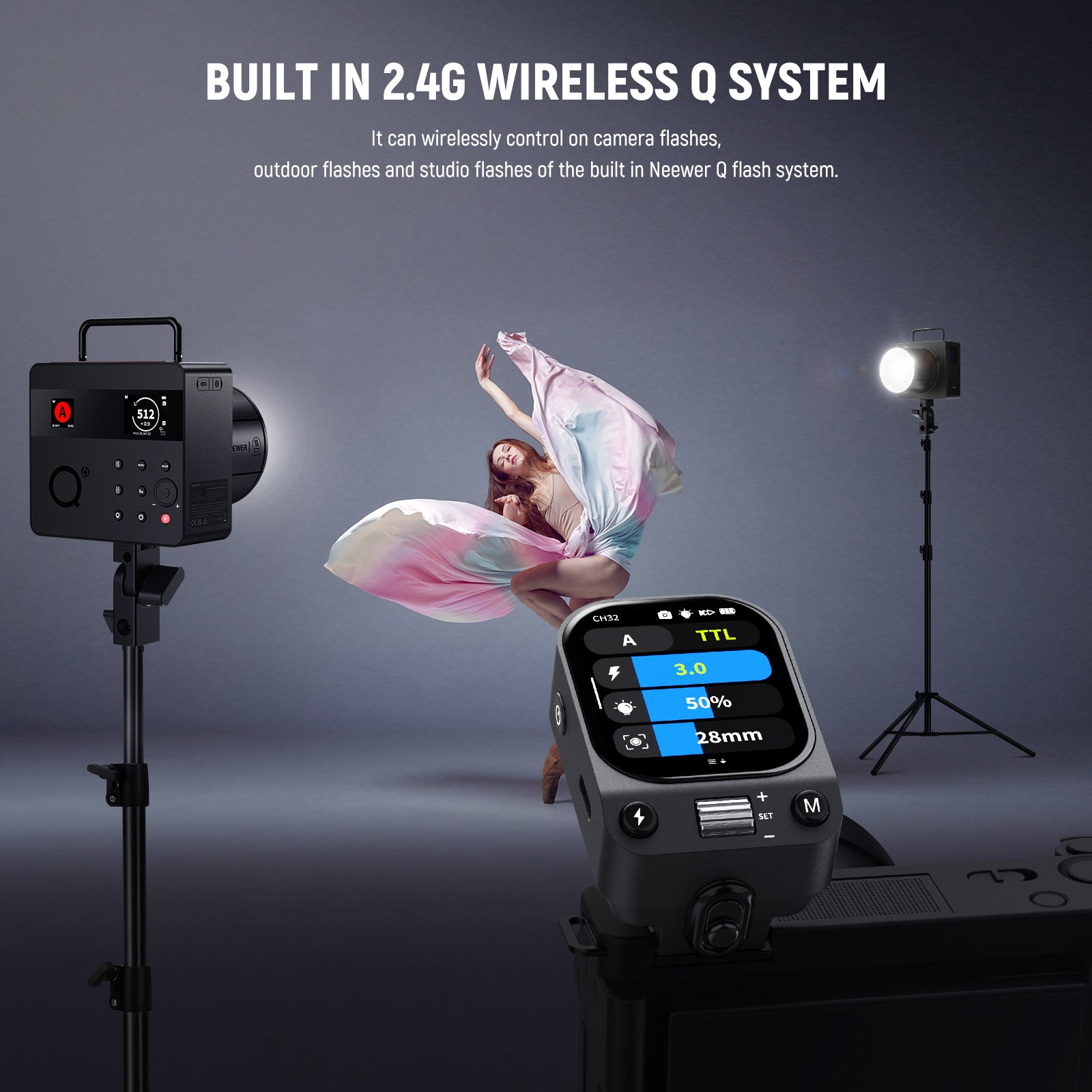 - Built In 2.4G Wireless Q System- Wirelessly trigger NEEWER NW420-C, Z1-C, Z2-C, Z760-C, Z880-C, NW760-C, Z2PRO-C, S102-400W Pro, NW655-C, and Q-C (only off camera triggering), or control other flashes without a Q system via a NEEWER QR receiver and a 2.5mm sync cord (all sold separately). Also with a channel scanning function to detect idle channels for less signal interference among 5 groups, 32 channels, and 01-99 IDs within 328'/100m