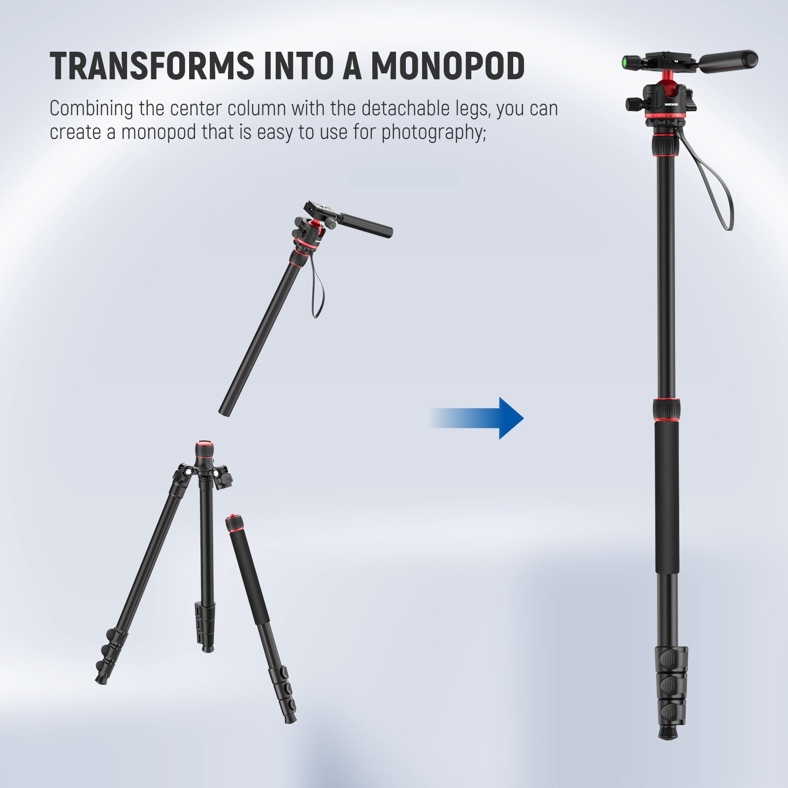 - Trípode y monopié 2 en 1 : ¡Cambia fácilmente de trípode a monopié! Simplemente separa una pata del trípode y fíjala a la columna central. Ideal para fotos profesionales y estables, fotos de larga exposición con el trípode y situaciones de movimiento rápido con el monopié. Además, ¡el monopié también puede usarse como bastón de trekking durante tus caminatas!