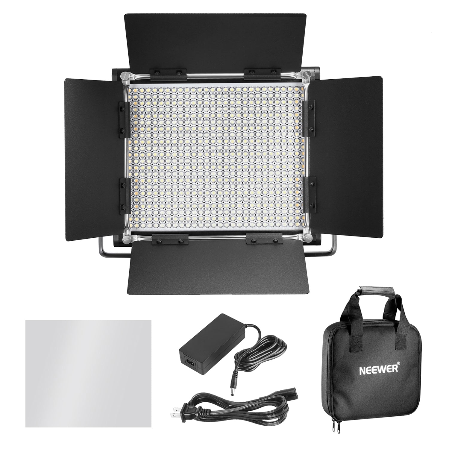 • La fijación de puertas de granero a las fuentes de luz crea una distribución uniforme del haz de luz; incluye un paño difusor blanco para suavizar la luz intensa y una bolsa de transporte para guardar la luz y los accesorios.