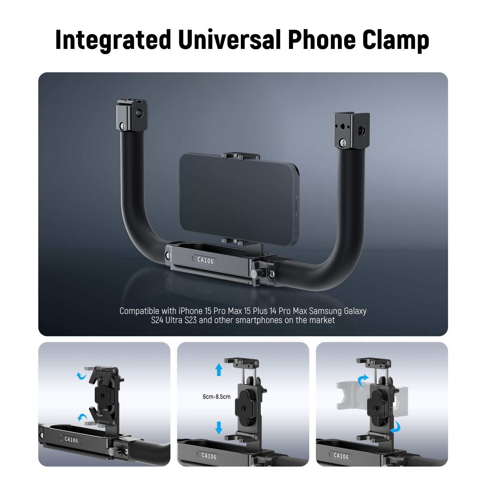 • Abrazadera universal integrada para teléfono : la abrazadera ajustable de 60 a 85 mm es compatible de forma universal con iPhone 16, 15 Pro Max, 15 Plus, 14 Pro Max, Samsung Galaxy S24 Ultra, S23 y otros teléfonos inteligentes. Las cámaras compactas sin espejo y las cámaras de videoblog también se pueden conectar a este estabilizador